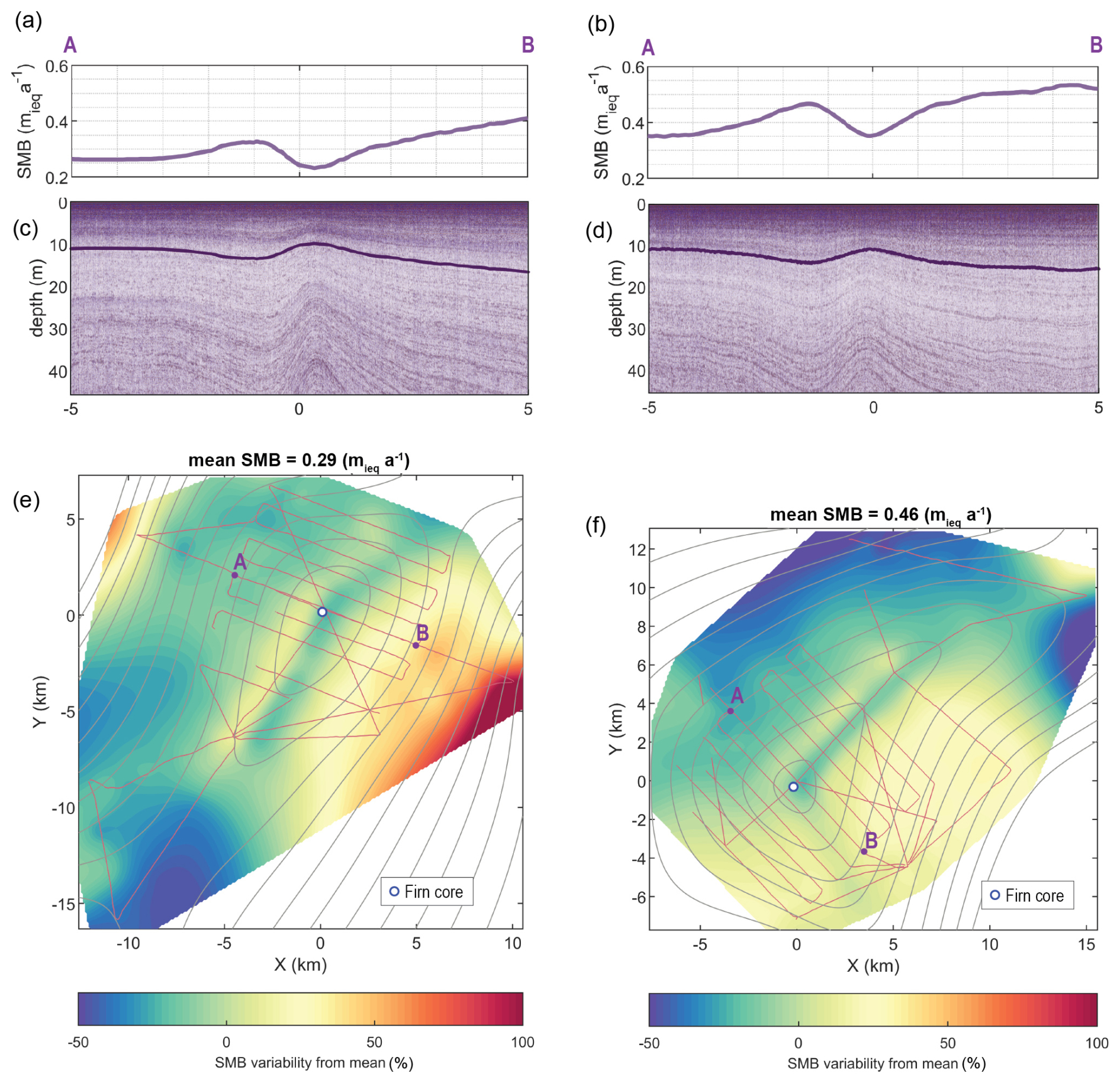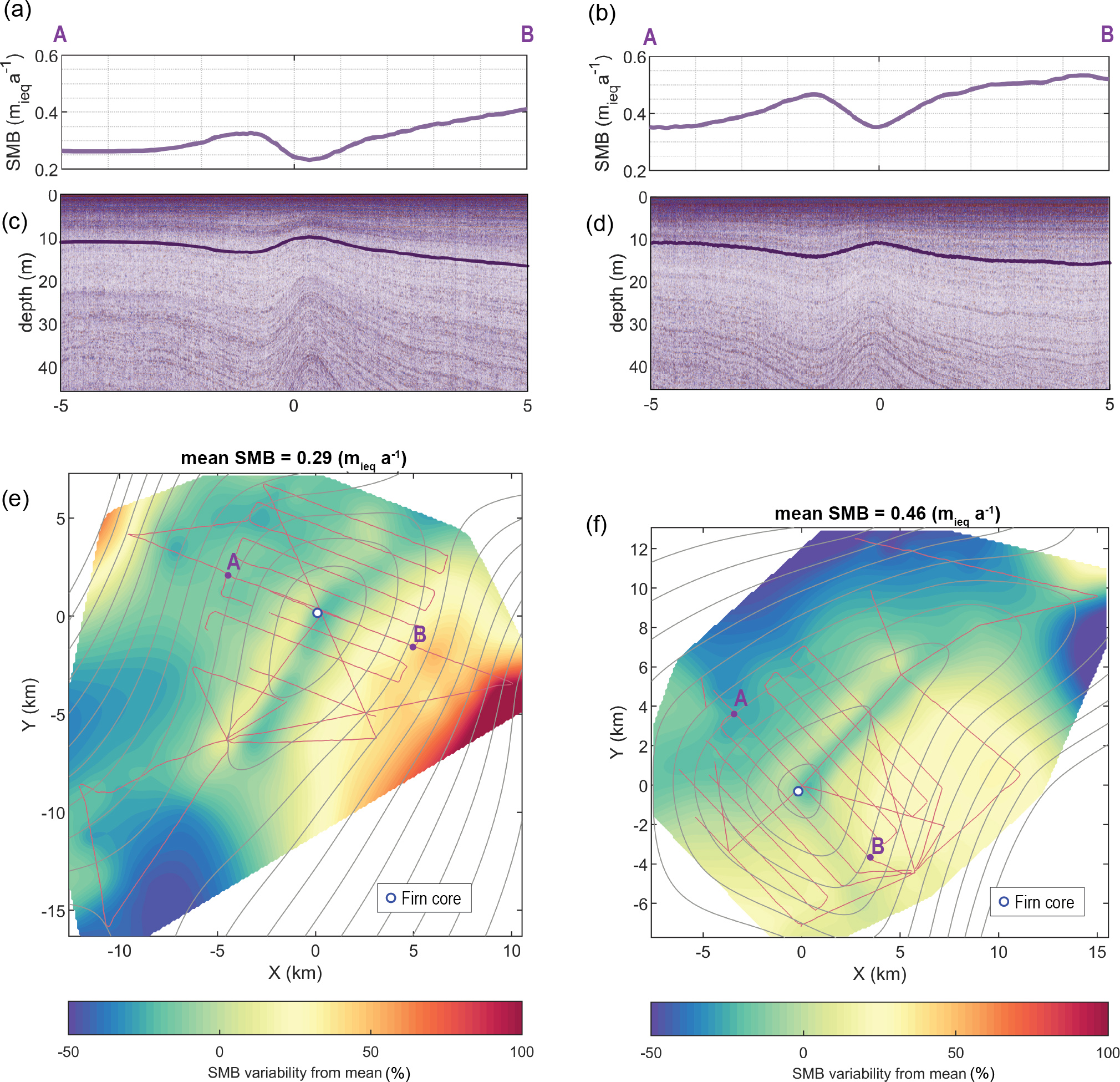 Figure 3Shallow-sounding radargrams and SMB maps. (a)–(b) show the SMB estimated using the dated IRHs in the radargrams shown in (c)–(d). (c)–(d) show shallow-sounding radargram profiles going across the summits of KAM and VER, going from A to B. The purple curves show the tracked IRHs over the radar survey, and the white circle shows the firn core's location used to date these IRHs. (c)–(d) show the map of SMB variability (%) referenced to the spatial mean of KAM and VER, respectively, using the IRH marked in (c) and (d). A and B markers show the starting and end points of the radargrams in (c) and (d). Surface elevation contours (20 m intervals (Howat et al., 2022)) and the radar profile locations (thin red curves) are shown as references.