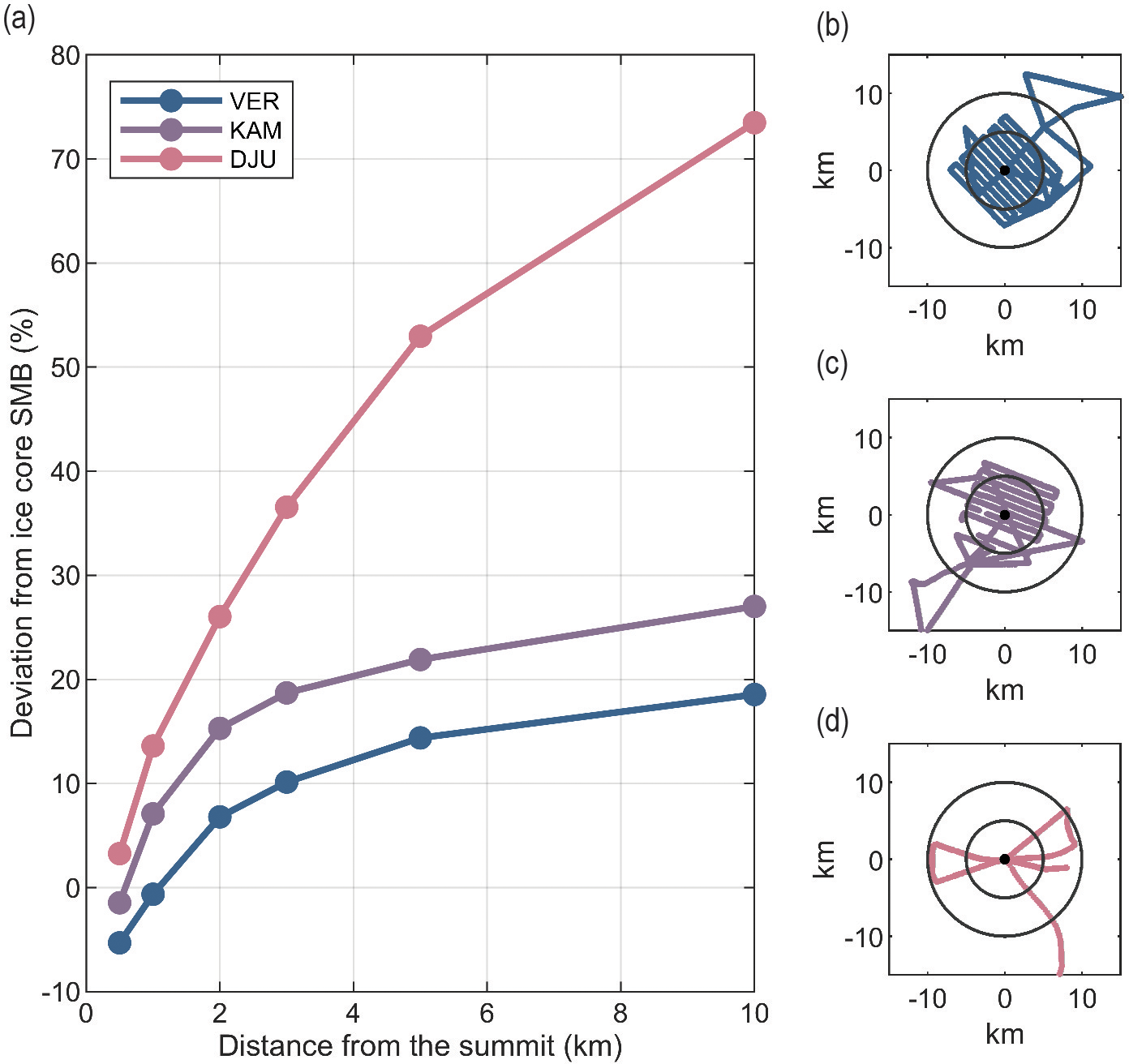 Figure 4Spatial representativity of the ice-core derived SMB. Change in mean difference between ice-core derived SMB and mean radar-derived SMB with increasing radial data coverage from the VER, KAM and DJU ice-core sites. (b)–(d) show the coverage of the radar surveys for the three ice rises, with two concentric circles of 5 km and a 10 km radius from the summit for reference.