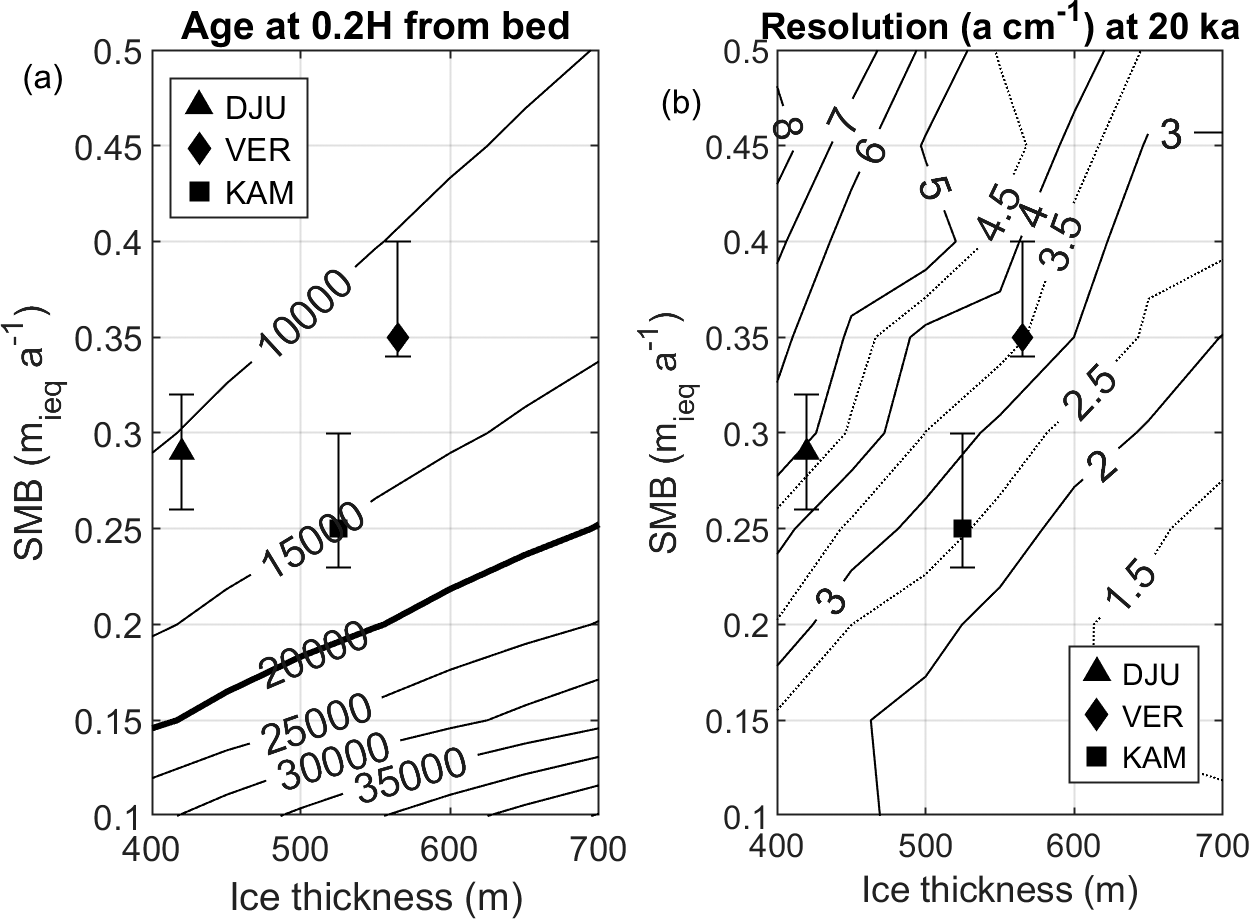 For resolution comparison, we compare the expected temporal resolution of retrieved ice from the Last Glacial Maximum (LGM; 20 ka), regardless of the depth at which this age is reached (Fig. 5b). We find that DJU exhibits the least favourable resolution (∼5 a cm−1) at 0.12H above the bed, VER an intermediate resolution (∼3.5 a cm−1) at 0.12H above the bed, and KAM the most favourable resolution (∼ 2.5 a cm−1) at 0.16H above the bed. As for the age-at-depth estimates, these differences are primarily caused by higher SMB at VER and thinner ice at DJU compared to KAM.