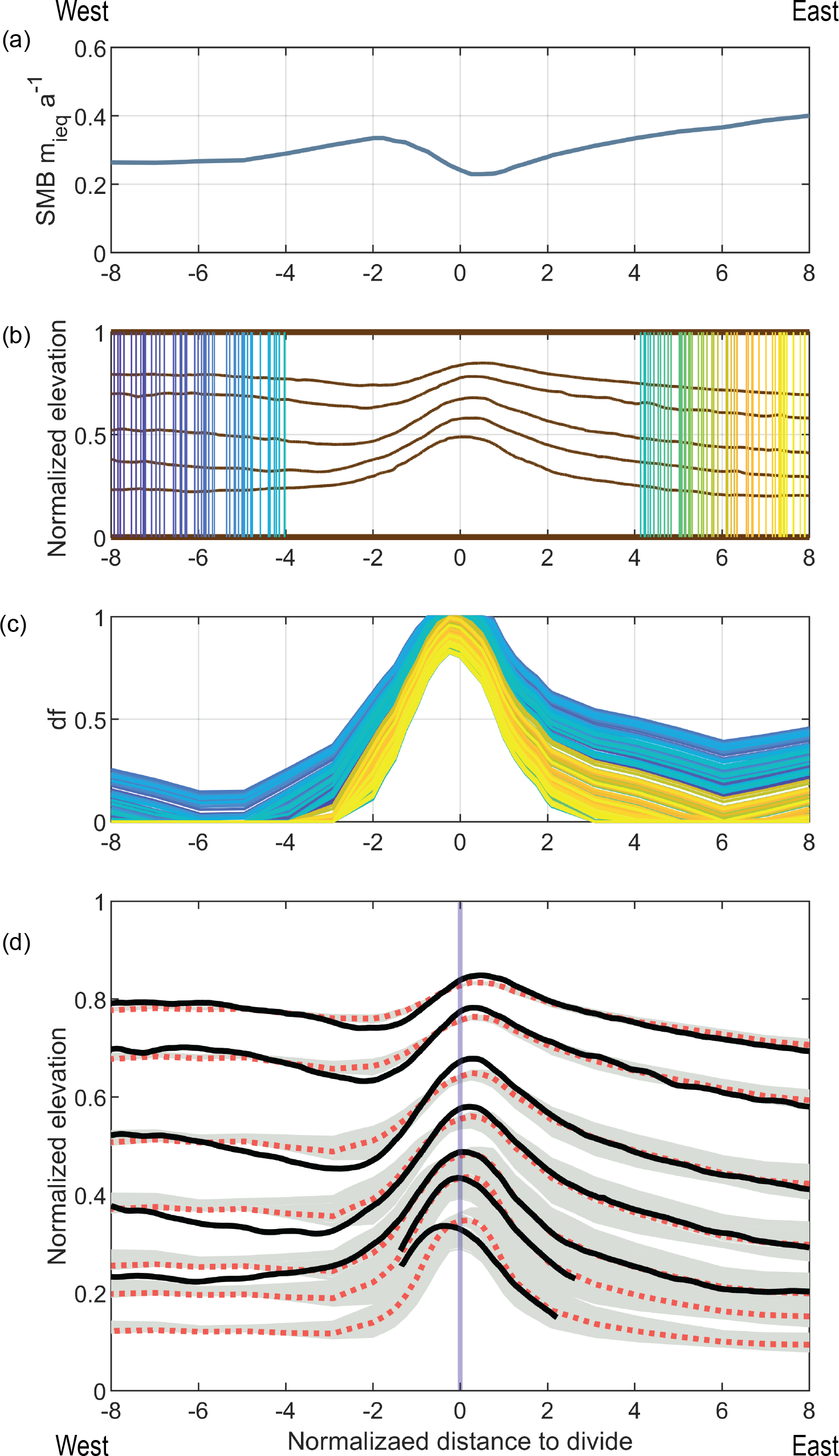 To describe the transition between the divide flow and flank flow, we introduce a scaling parameter, df, that varies from 0 to 1 spatially, with one indicating that the ice flow regime is characteristic of a divide region and 0 for a typical flank flow. Thus, using df, the shape function η can be determined as: