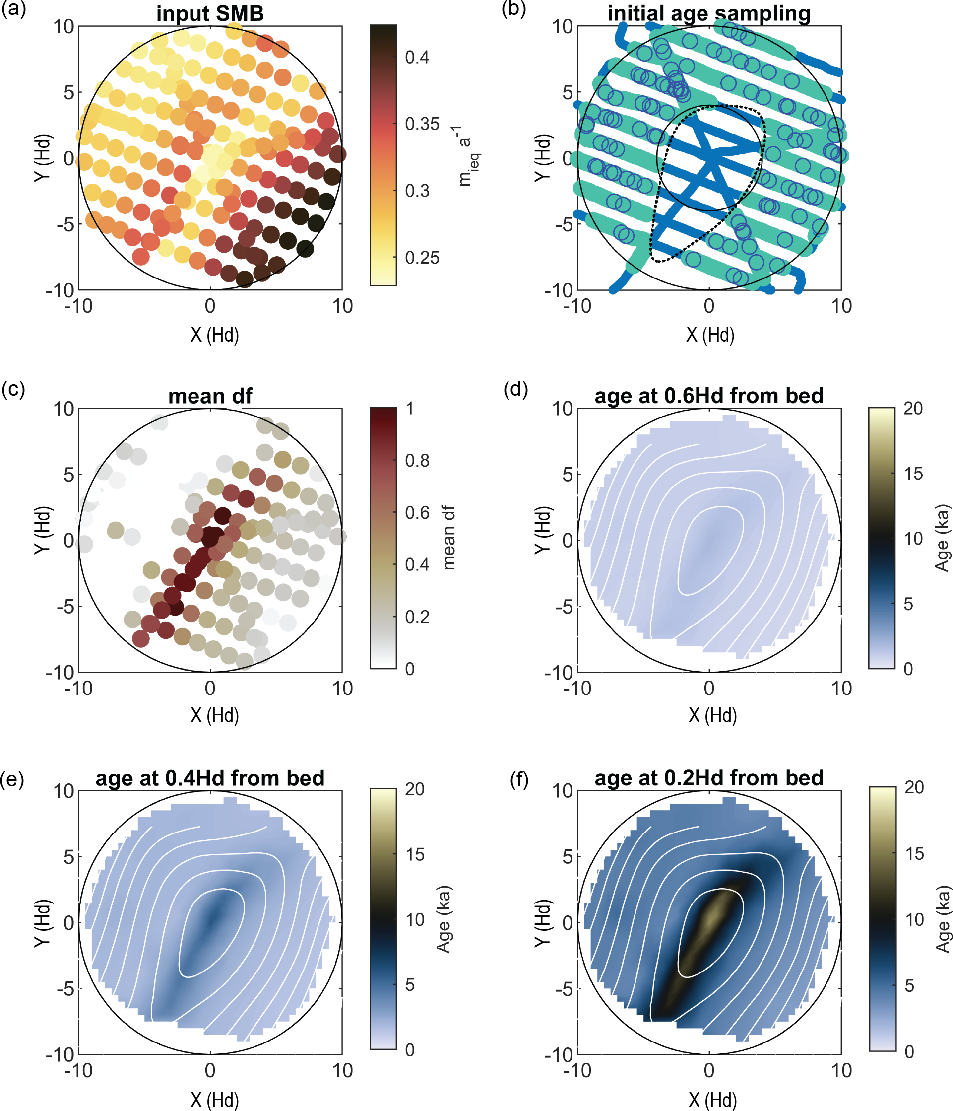 Here, we evaluate the spatial distribution of age in the vicinity of the summit by implementing our method over the survey grid within 10Hd radius around the summit, where Hd stands for the ice thickness at the divide, 525 m (Table 1). For this setup, we define the divide region as the area within 4Hd from the summit and the vicinity of the southward ridge, approximated as the area where the surface elevation is higher than 350 m (Fig. 8b). As for the profile modelling (Sect. 4.2.1), we first date the IRHs at 120 random locations outside the divide area (marked with blue circles in Fig. 8b) using randomly selecting p values between 2–4. These dated IRHs were then used to invert for df over the whole region within a 10Hd radius of the summit. The inverted df values distinctly highlight the presence of divide flow with higher values along the ice rise's ridge (Fig. 8c). Using the df values and p=3, we estimate the age-depth relationship over the area within 10Hd around the summit. Estimates of the age are shown at depth-slices of 0.6Hd, 0.4Hd and 0.2Hd above the bed in Fig. 8d–f. The older ice is located along the ridge of the ice rise, with the maxima very close to the summit.