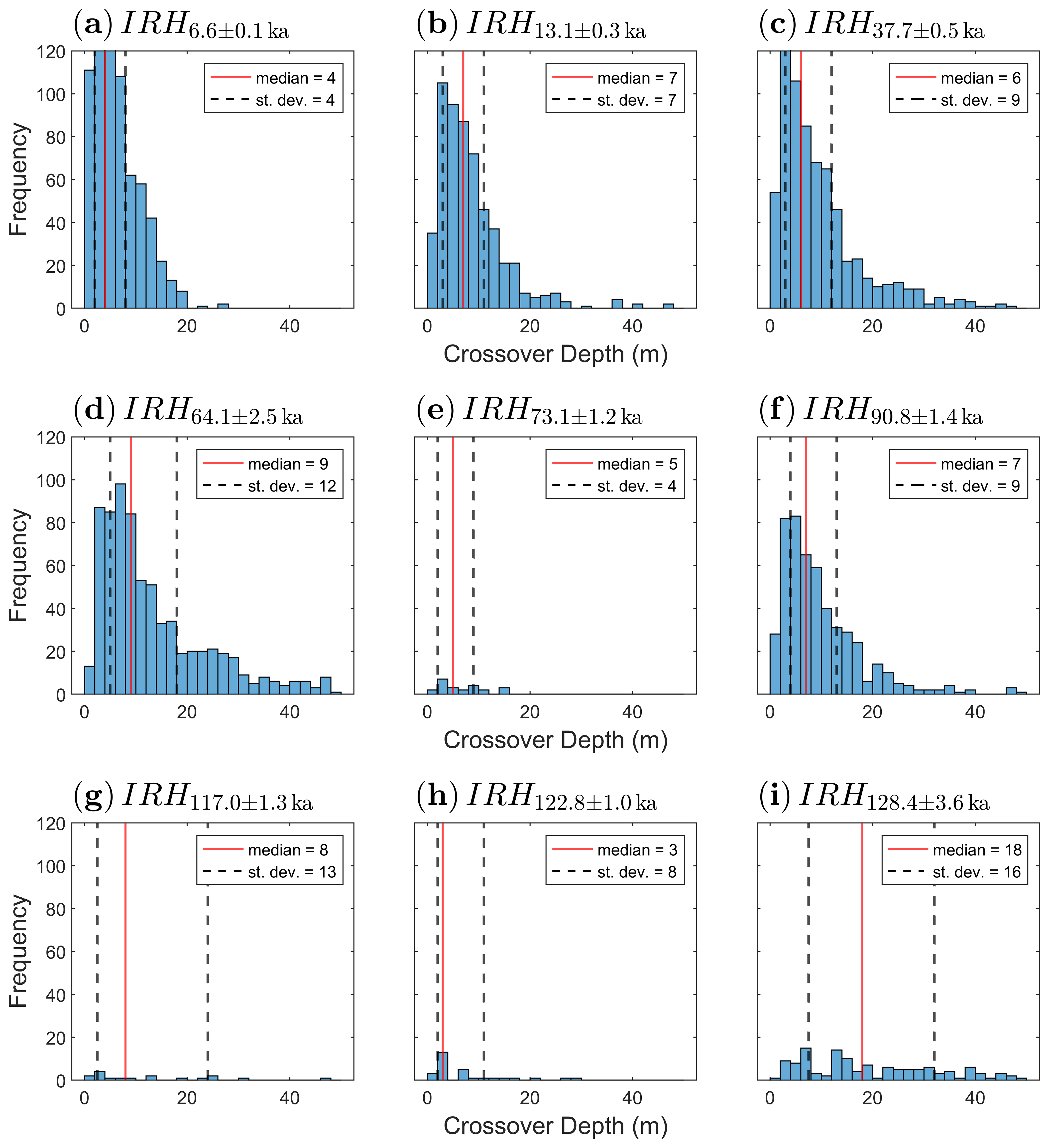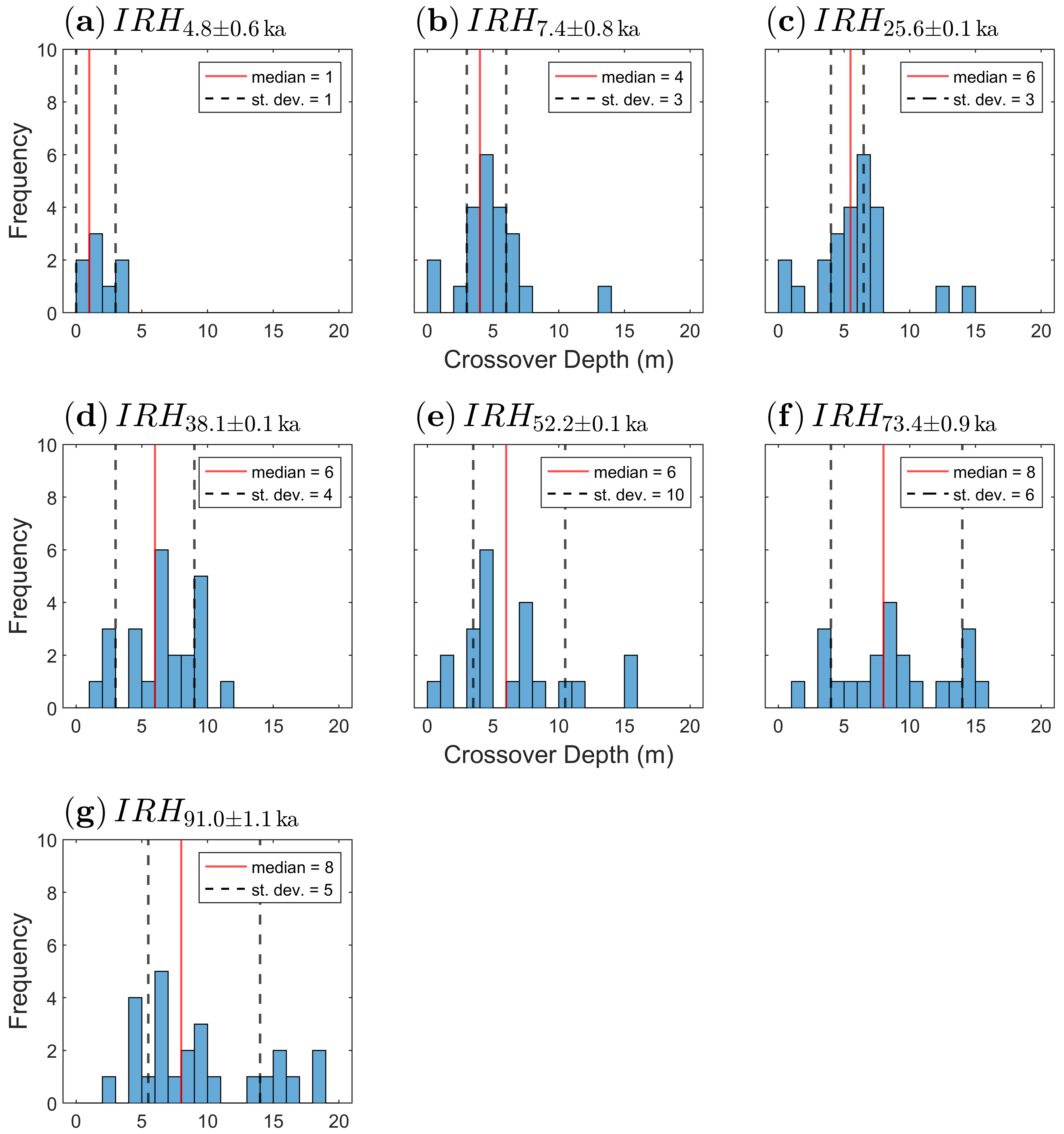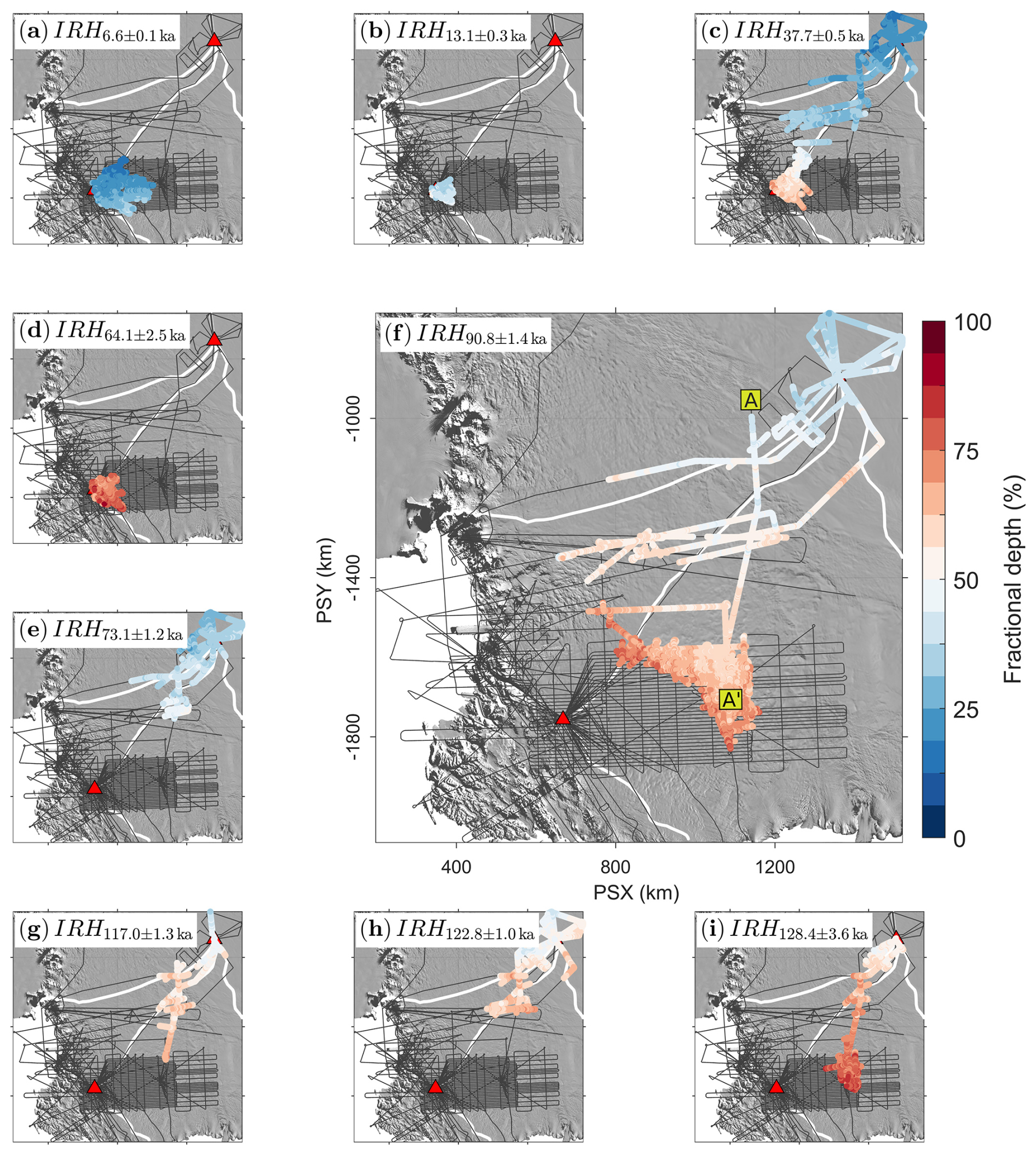 Over DML, we traced a total of seven IRHs across all survey lines, with ages from younger to older: 4.8 ± 0.6, 7.4 ± 0.8, 25.6 ± 0.1, 38.1 ± 0.1, 52.2 ± 0.1, 73.4 ± 0.9, and 91.0 ± 1.1 ka (Fig. 3 and Table 2).
