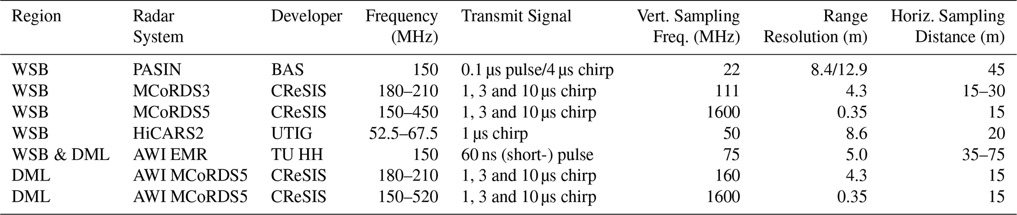 Table 1Specifications of the airborne radar systems used in this study over the WSB and DML regions. For PASIN, we provide the transmit signal and range resolution for the pulse and chirp modes, respectively. All values for the range resolution are calculated using an electromagnetic wave speed in ice of 168.5 m s−1. The horizontal sampling distances are typical values after post-processing. The vertical resolution of the chirp systems was calculated following CReSIS using a scaling factor k accounting for resolution degradation. TU HH in the table refers to the Hamburg University of Technology who designed the early EMR system for AWI.