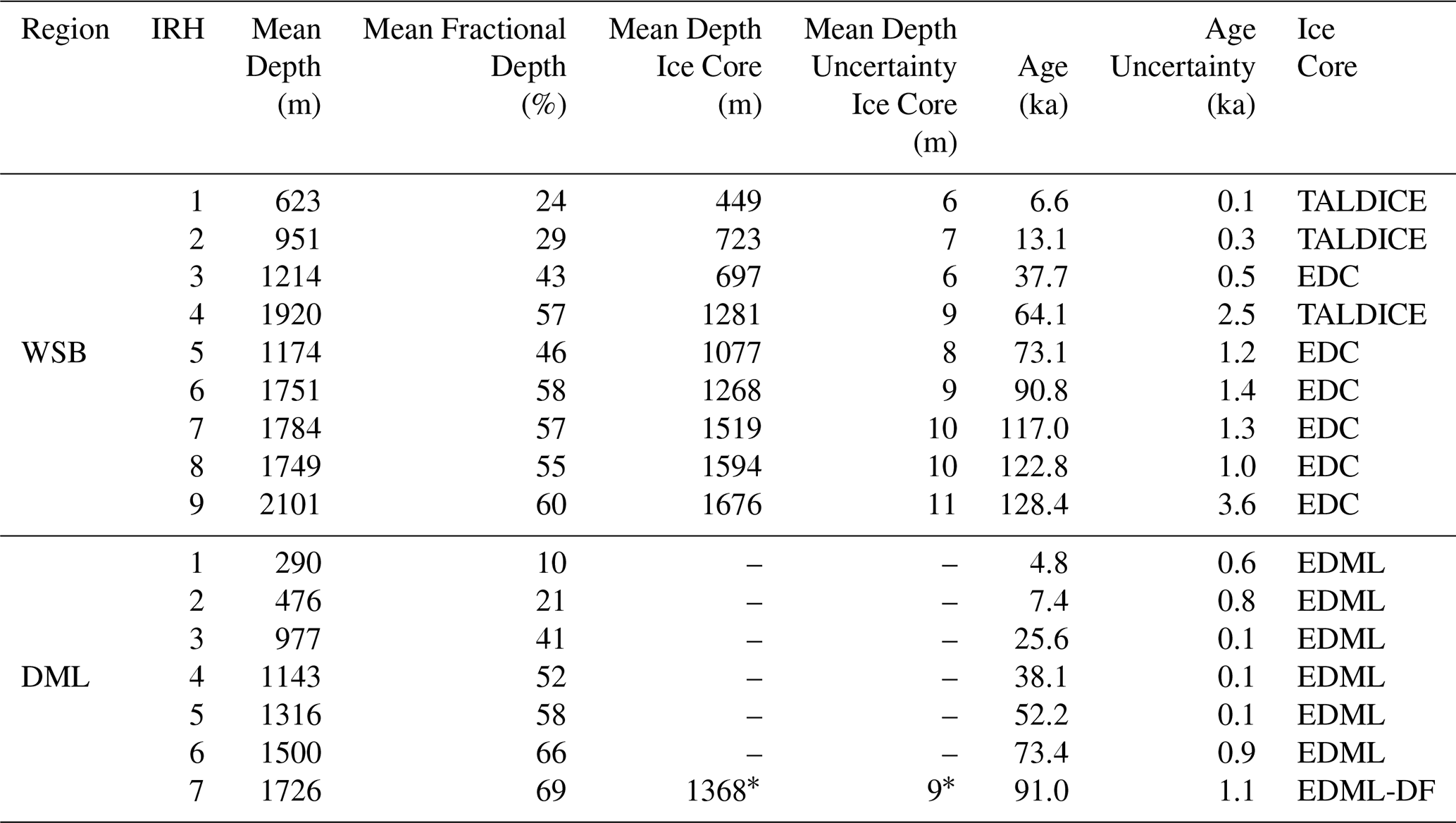 Table 2Depth and age statistics for all isochrones mapped on WSB and DML. Columns 3 and 4 are provided for all data points across both catchments, whereas column 5 refers to the mean depth at the respective ice core specified in column 8, averaged across a pre-defined radius around the ice cores (see Sect. 2.2.3). Columns 5–6 for the DML region are blank for IRH 1-6 as these were traced and dated by Franke et al. (2025b) (refer to their paper for these values). * For IRH 7 over DML, we provide the mean depth and mean depth uncertainty at Dome Fuji (DF) ice core, but the age and age uncertainty is the one provided by Franke et al. (2025b) at EDML.