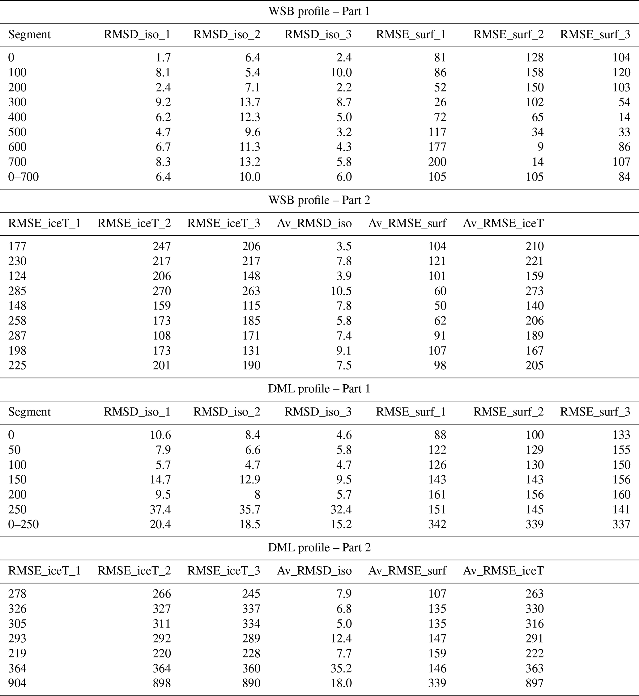Table C1Values for RMSD (91 ka isochrone elevations; in %) and RMSE (surface elevations or ice thicknesses; in metres) between observed and modelled surfaces, calculated for each of the three simulations shown in Fig. 4 for 100 (WSB) or 50 (DML) km segments, as well as for the entire length of the profile (last row). “Av” stands for average, “surf” for surface elevation, and “iceT” for ice thickness.
