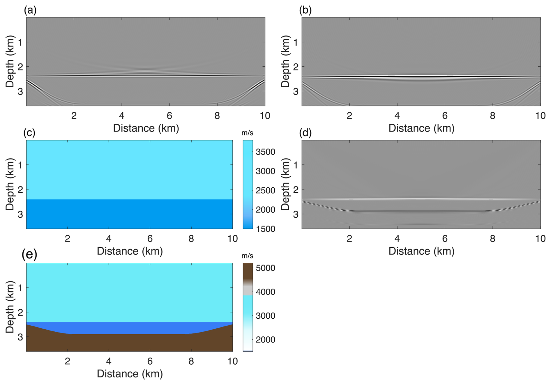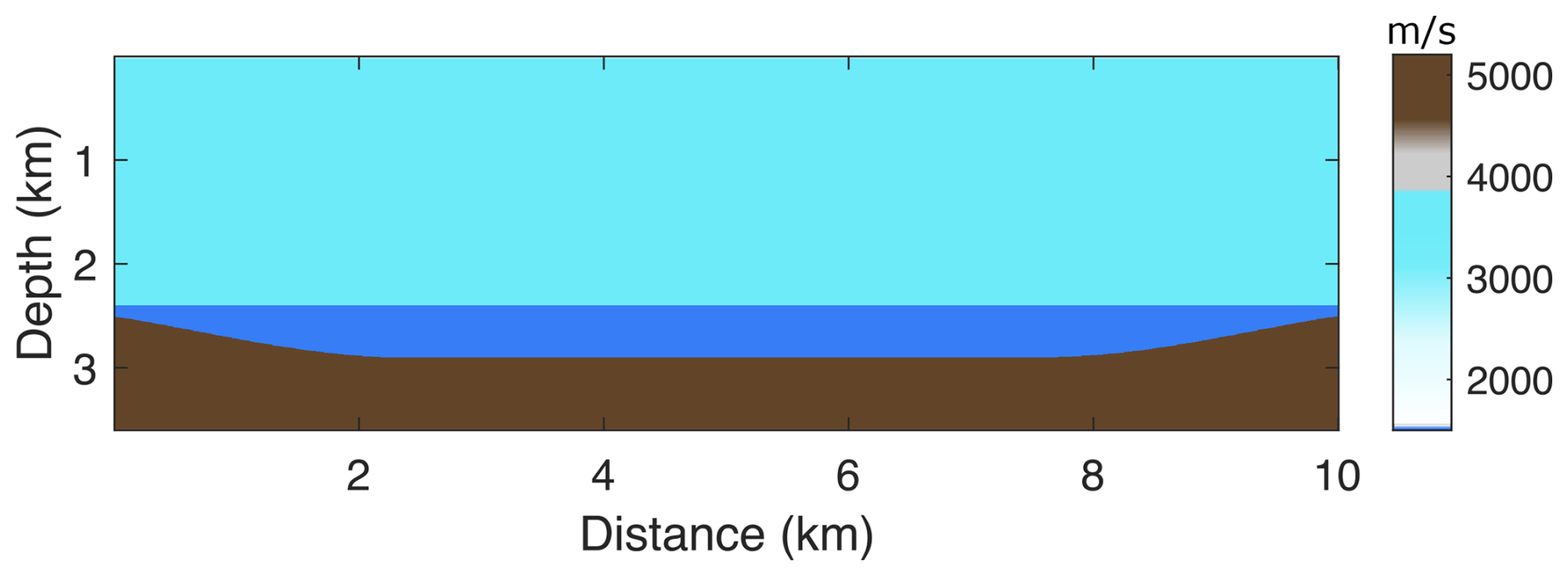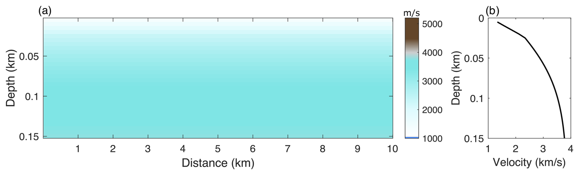Figure 1a illustrates a typical subglacial velocity model, with a depth of 3.6 km and a horizontal extent of 10 km. The model consists of a thick ice sheet, a subglacial lake, and the underlying bedrock.