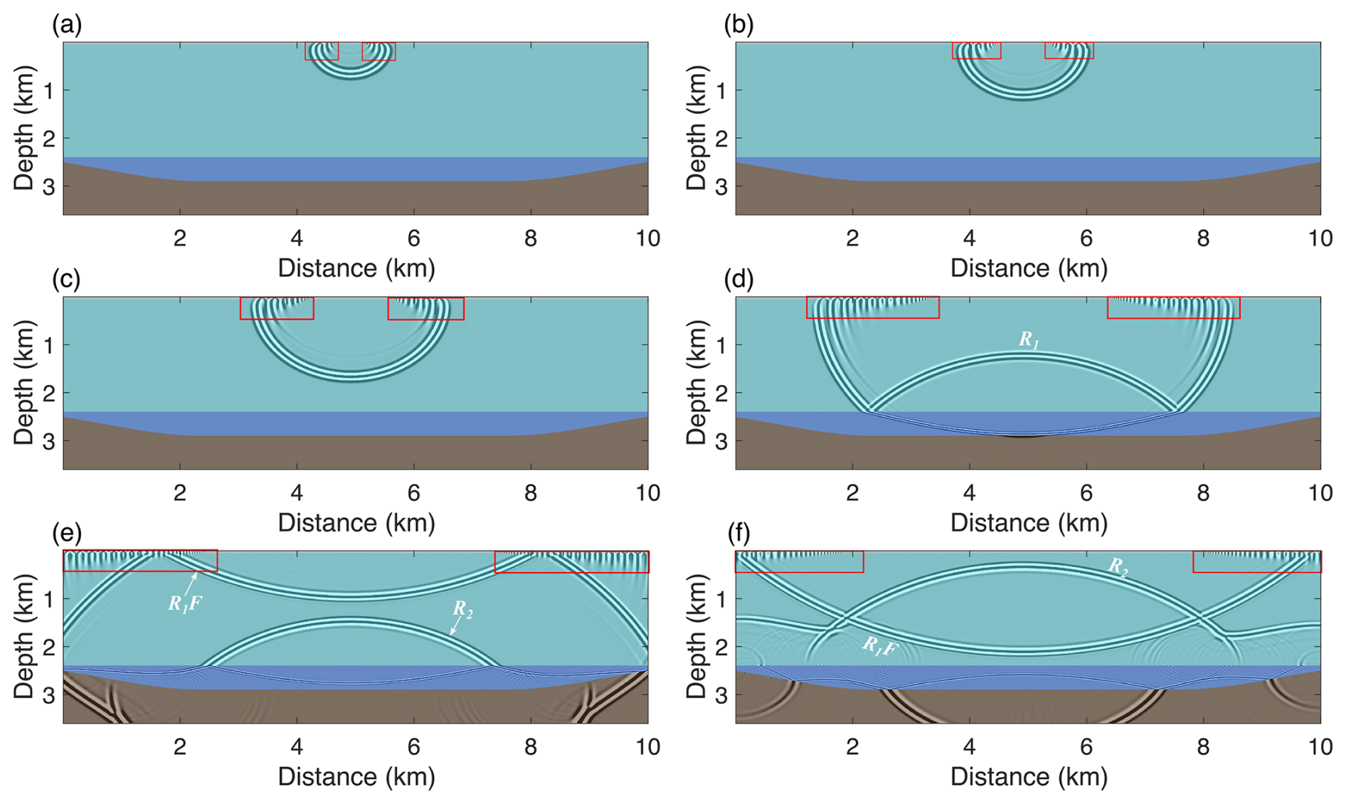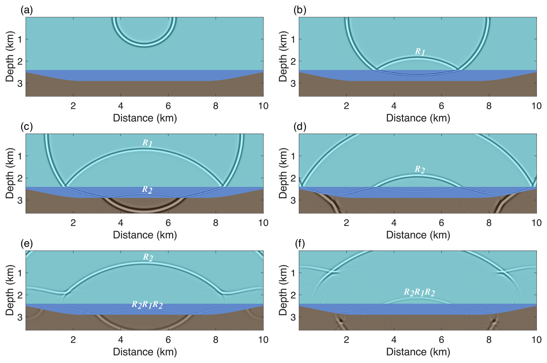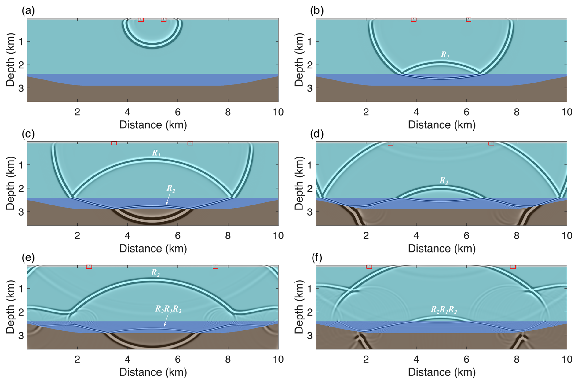 Figure 2 presents wavefield snapshots at various time steps. Upon triggering the source, a direct wave (Fig. 2a) is generated and propagates downward as a spherical wave. Upon reaching the ice-water interface (Interface 1), part of the energy is reflected, forming the primary reflection wave R1 (Fig. 2b). Due to the significant impedance contrast between ice and water, the reflection coefficient at the ice-water interface is negative, resulting in a polarity reversal of the reflected wave. Additionally, a portion of the direct wave's energy transmits downward into the lake. When this energy reaches the water-bedrock interface (Interface 2), it generates the primary reflection wave R2 at the water-bedrock boundary (Fig. 2c and d). The reflected wave R2 then propagates upward and partially reflects downward again at the ice-water interface, returning to the lake. This wave reflects once more at the ice-water boundary, forming a first-order interlayer multiple R2R1R2 (Fig. 2e). This interlayer multiple continues to oscillate within the water layer, generating higher-order multiples.