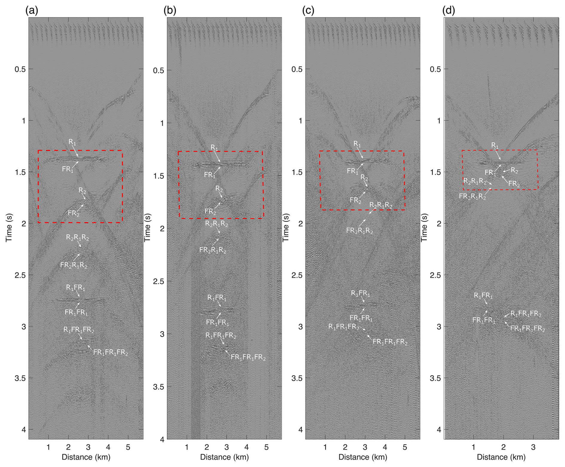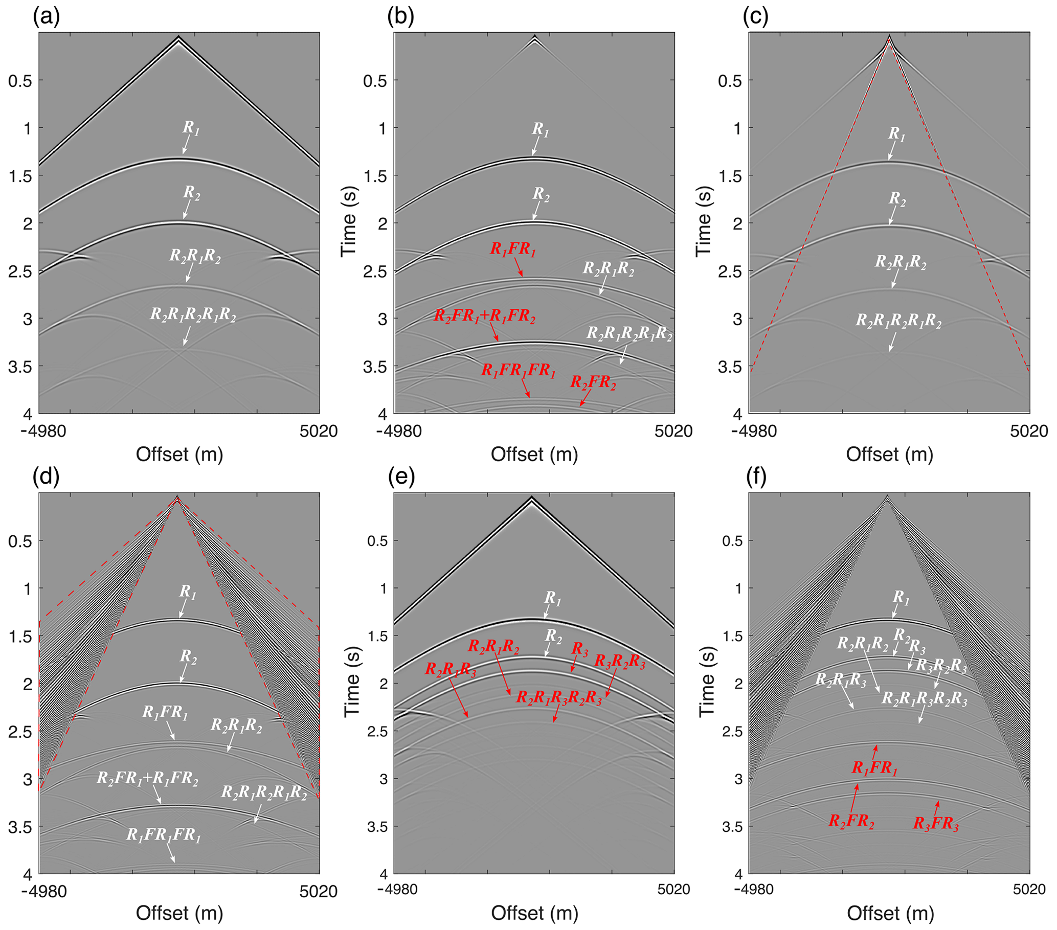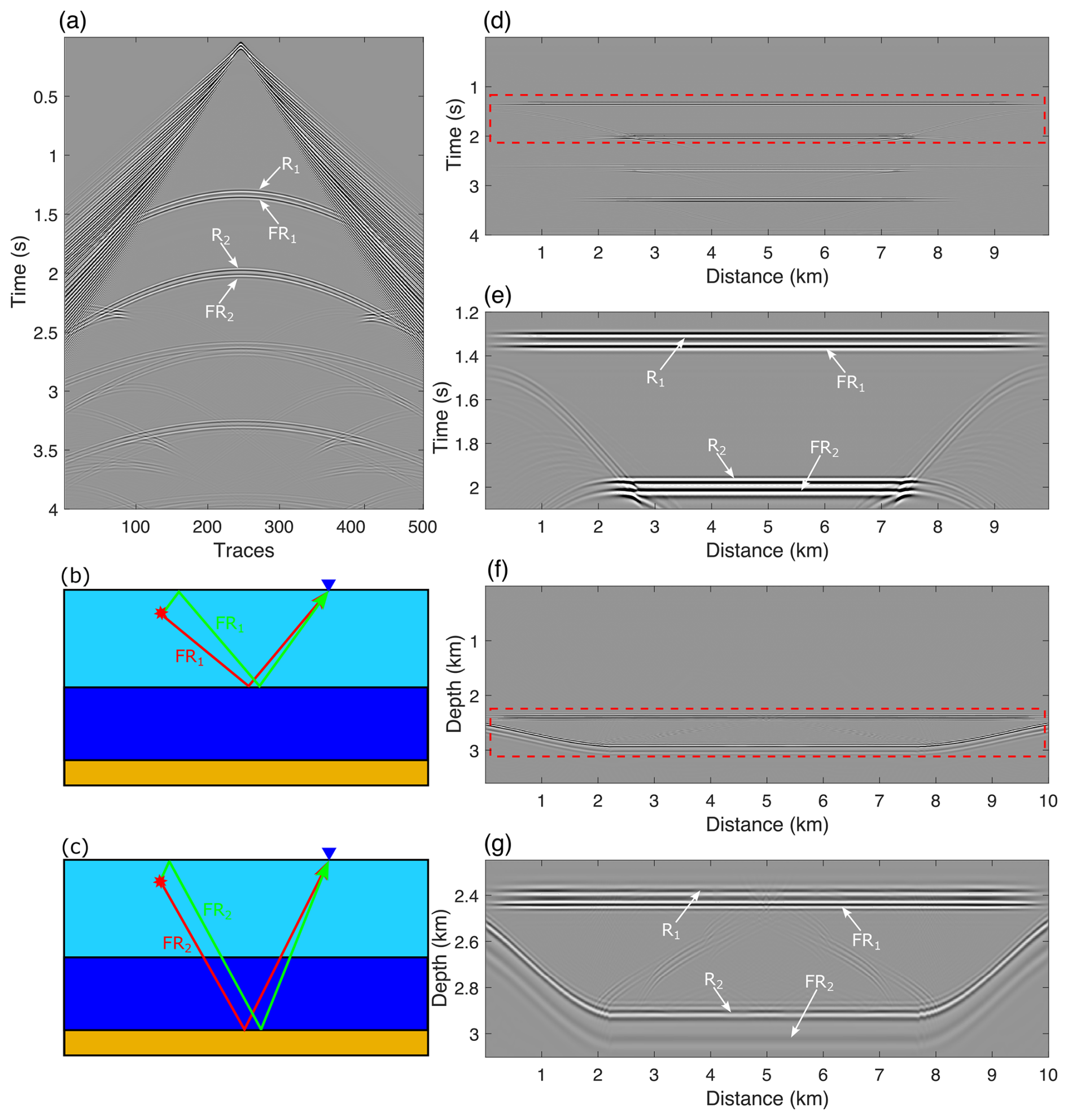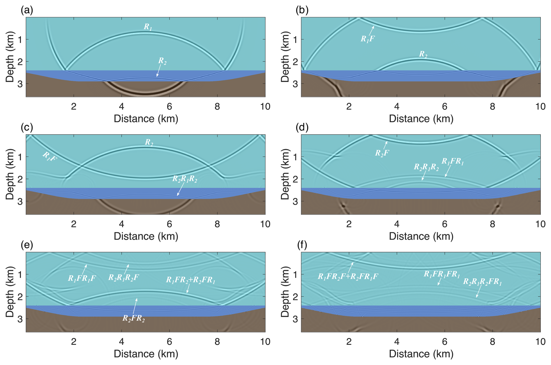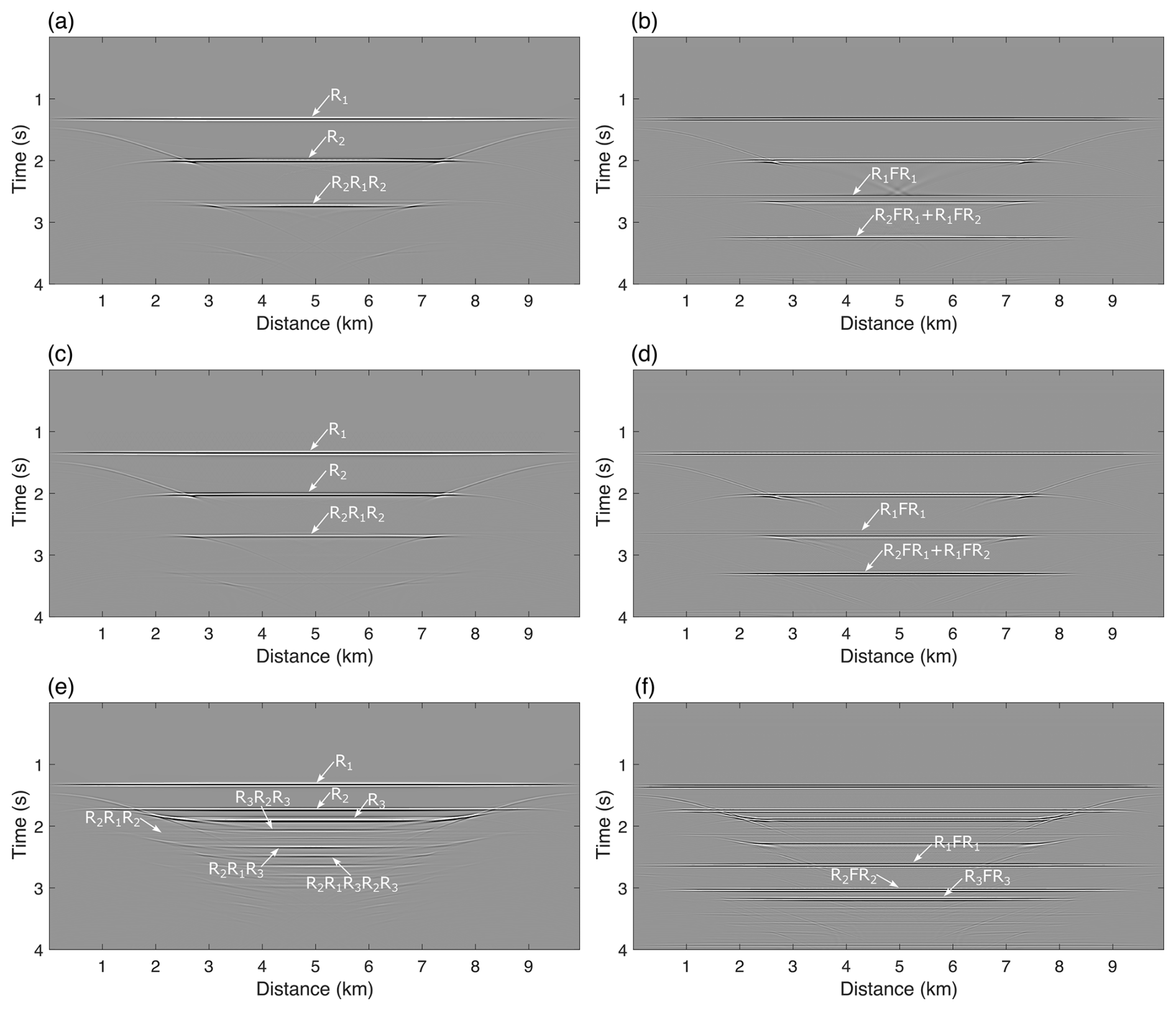 Applying a free-surface boundary condition at the model surface generates numerous free-surface multiples that are absent when an absorbing boundary condition is used (Fig. 12b), including first- and second-order free-surface multiples (R1FR1 and R1FR1FR1) and hybrid multiples (R2FR1 and R1FR2) propagating across the ice sheet and water layer.