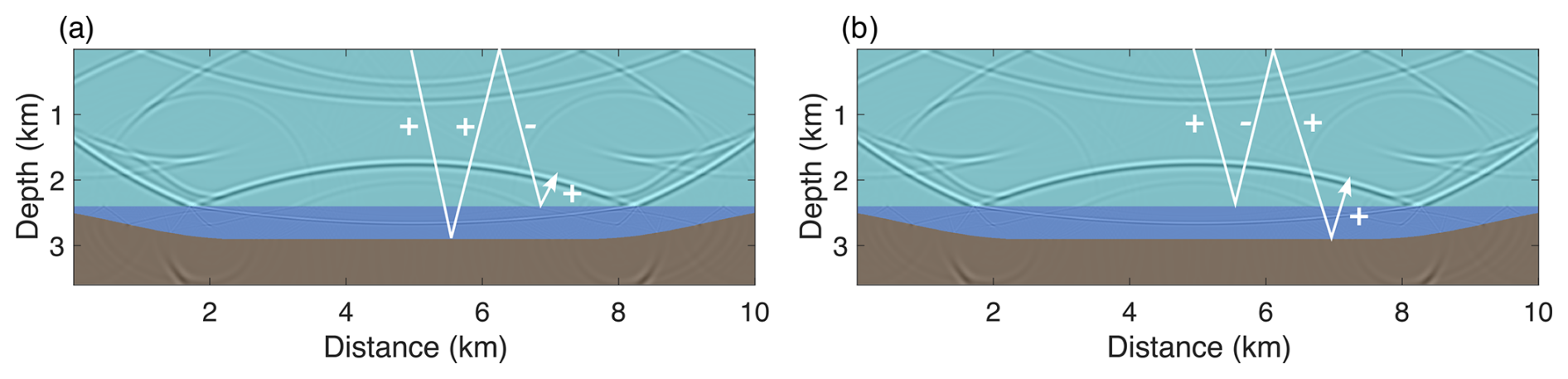 Both free-surface and interlayer multiples follow the primary reflections, with their time delays determined by the thicknesses and velocities of the ice sheet, water layer, and sediment. Only a subset of multiples is shown in Figure 12, due to the limited simulation time adopted in this study, longer records would capture higher-order multiples, although their amplitudes decrease rapidly with increasing order. Multiples can be both problematic and advantageous. Conventional seismic processing typically addresses only primary reflections, and misidentifying multiples as primaries introduces artifacts. However, because multiples undergo more reflections within the subglacial structure than primaries, they are more sensitive to velocity variations and offer significant potential for super-resolution imaging of subglacial structures.