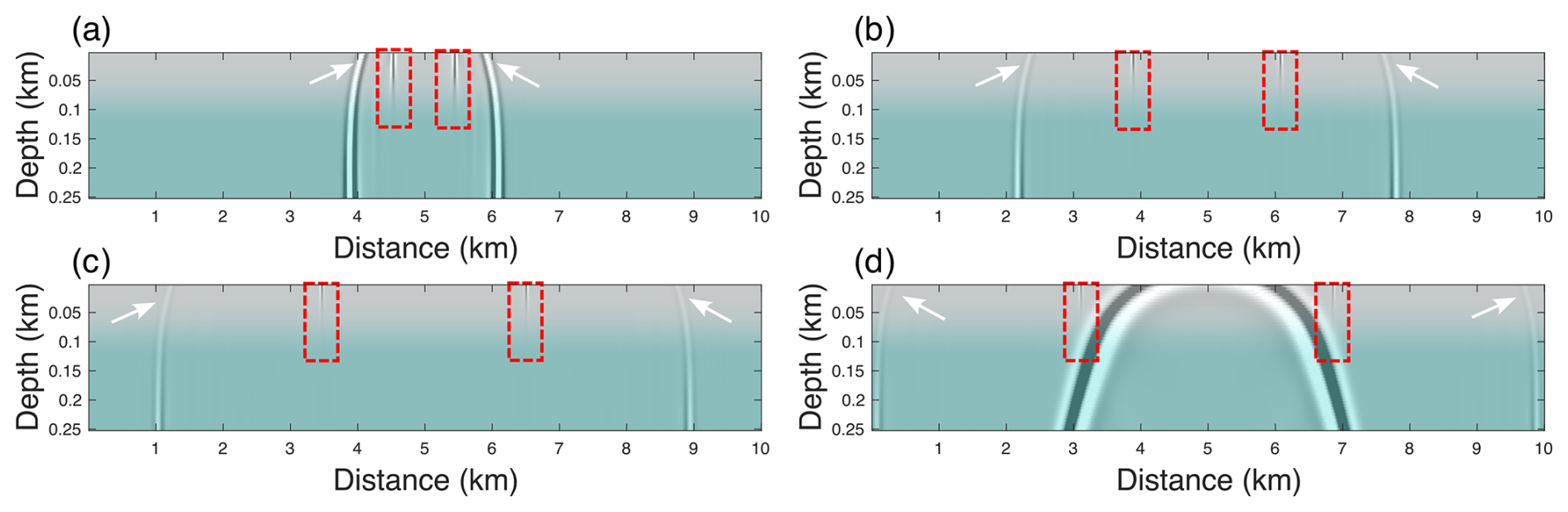 Compared with the free-surface-only case, the coexistence of the firn layer and free surface gives rise to pronounced guided wave in the red-boxed region of Fig. 12d, generated by refracted energy repeatedly interacting with the free surface.