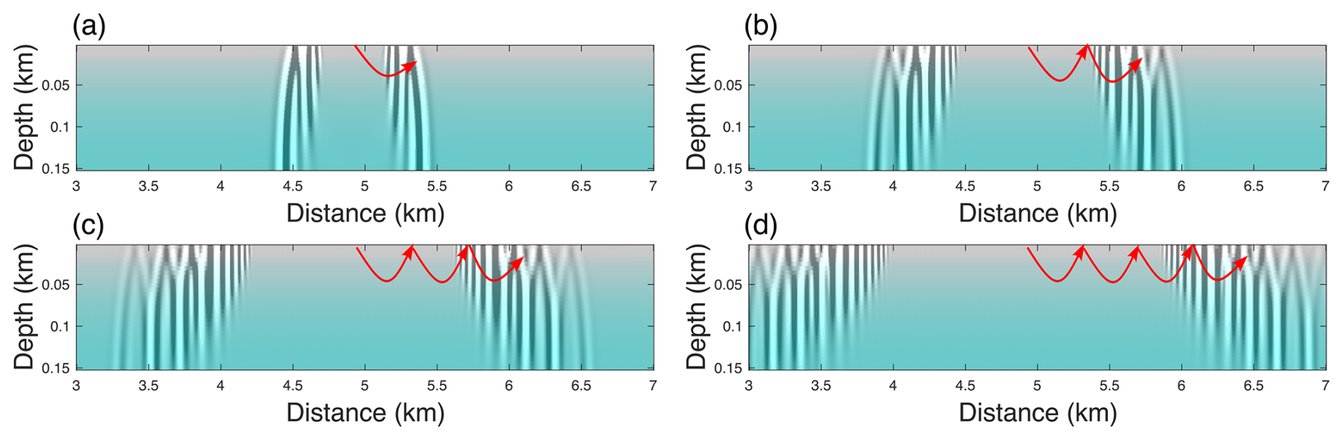 In realistic settings, the firn layer coexists with the free surface and is included in our wavefield simulations. As shown in Fig. 8, a prominent feature is the generation of guided waves within the firn layer, which essentially correspond to multiple orders of the refracted wave. Their ray paths are shown in Fig. 9. Higher-order refracted waves appear at later times and require longer offsets for observation. In seismic records (Fig. 12d), these refracted waves are represented as a series of linear events with identical slopes, consistent time delays, and uniform offset intervals. Analyzing these guided waves provides valuable insights into the structure of the firn layer (Boiero et al., 2013; Li et al., 2018).