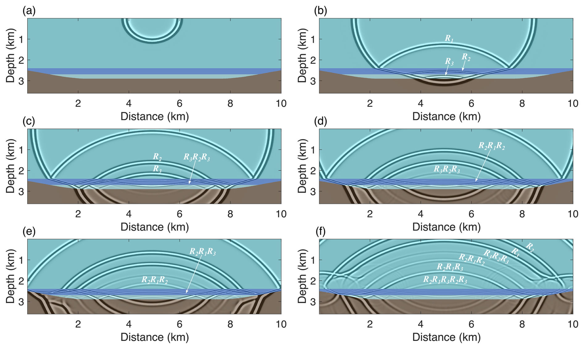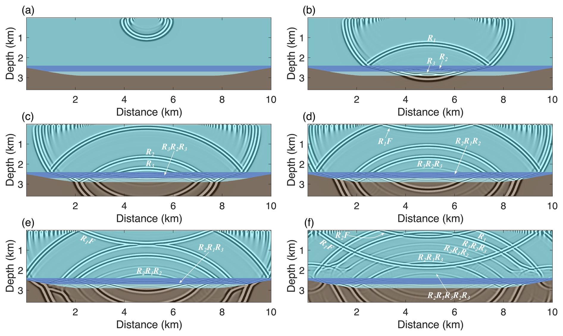 The presence of a sediment layer introduces a significant feature: the generation of interlayer multiples within the sediment. As shown in Fig. 10b, the downgoing direct wave initially generates primary reflections R1, R2, and R3 at the ice-water, water-sediment, and sediment-bedrock interfaces, respectively. Due to the thinness of the sediment layer, reflection R3 quickly produces a first-order interlayer multiple, R3R2R3, within the sediment shown in Fig. 10c. This interlayer multiple continues to oscillate within the sediment, generating higher-order multiples. Furthermore, reflections R2 oscillate within the water layer, forming a first-order interlayer multiple, R2R1R2, within the water layer (Fig. 10d), and R2R1R3 across both the sediment and water layers (Fig. 10e).
