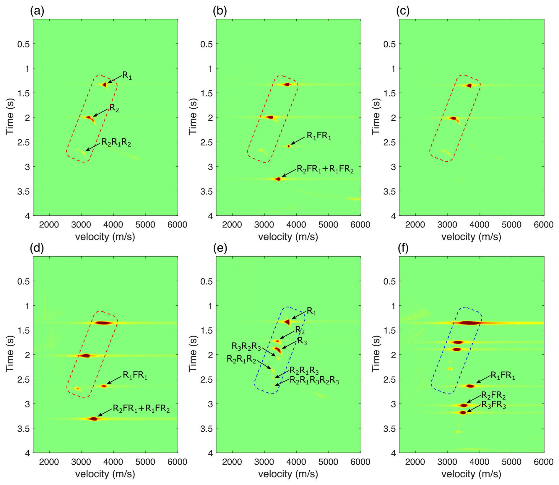 The energy clusters in Fig. 13a represent, from top to bottom, the primary reflections R1 and R2 at the ice-water and water-bedrock interfaces, respectively, as well as the first-order interlayer multiple R2R1R2 in the water layer. Due to the significantly lower velocity of water compared to glacial ice, the stacking velocity of R2 is lower than that of R1. Furthermore, as R2R1R2 travels further within the water layer and is treated as a primary reflection during velocity analysis, its stacking velocity is also lower than that of R2. Higher-order multiples within the water layer exhibit even lower stacking velocities, but these energy clusters are challenging to detect due to rapid amplitude attenuation after multiple reflections. Including the free surface in the model preserves the energy clusters observed in Fig. 13a (red dashed box) and introduces strong clusters associated with free-surface multiples. The stacking velocity of the first-order multiple (R1FR1) is close to that of the primary reflection R1, whereas the first-order interlayer multiples (R2FR1 and R1FR2) exhibit lower stacking velocities.