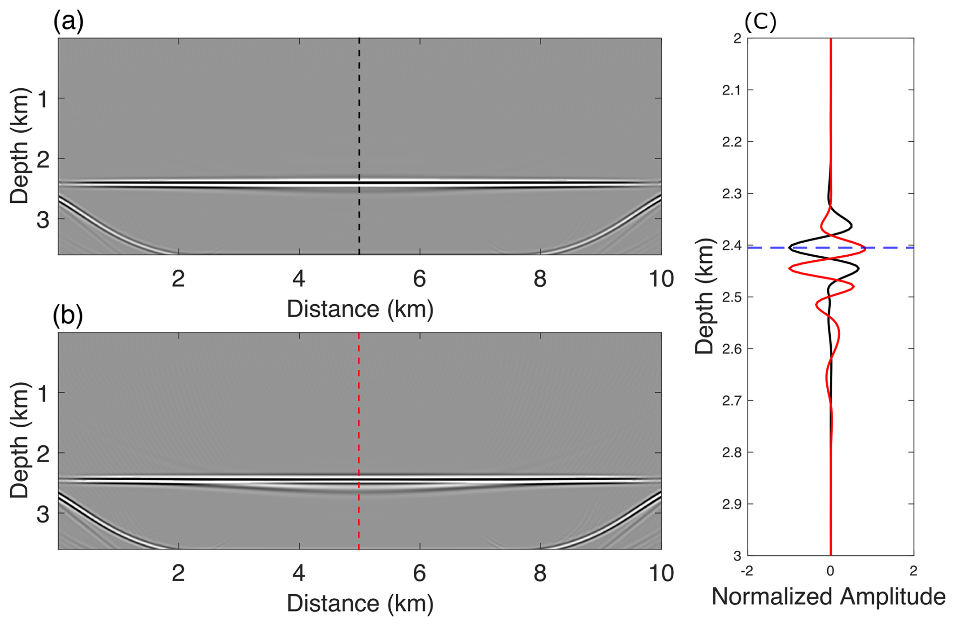 Figure 16Migration results using a constant 3800 m s−1 velocity model: (a) with and (b) without the firn layer. (c) Depth profiles at x=5 km, where black and red curves correspond to migrations with and without the firn layer, respectively. The blue dashed line denotes the true ice–water interface depth.