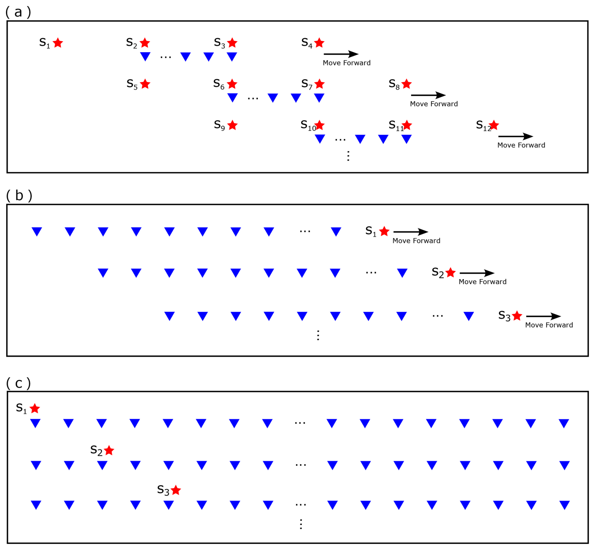 Figure 18Comparisons of three active seismic data acquistion system, which are (a) leap-frog, (b) snow- streamer and full-coverage system.