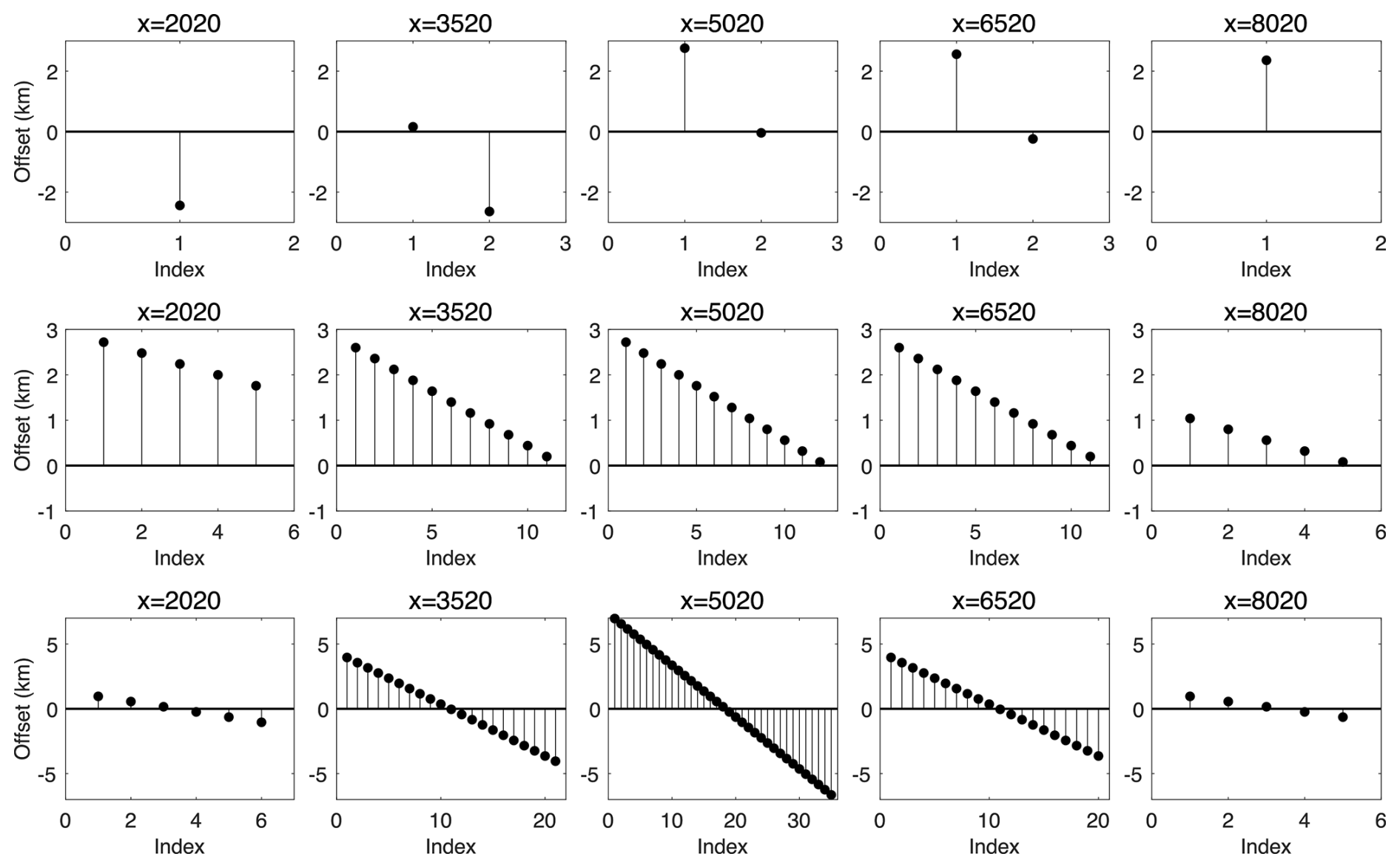 Figure 20 shows the coverage uniformity of the three acquisition systems. In the leap-frog system, each midpoint has both low fold and highly variable source–receiver offsets, which can lead to two issues: (1) for pre-stack data with low signal-to-noise ratio, stacking fails to sufficiently enhance the SNR; and (2) reliable amplitude-versus-offset (AVO) information is difficult to obtain, limiting the characterization of rock properties across interfaces (Buland and Omre, 2003; Peters et al., 2008). By contrast, the snow-streamer and full-coverage systems achieve higher and more uniform fold with a broader range of offsets. The snow-streamer samples only positive offsets due to its single-sided shooting, whereas the full-coverage system provides a symmetric distribution; overall, both systems ensure more reliable imaging and AVO analysis.