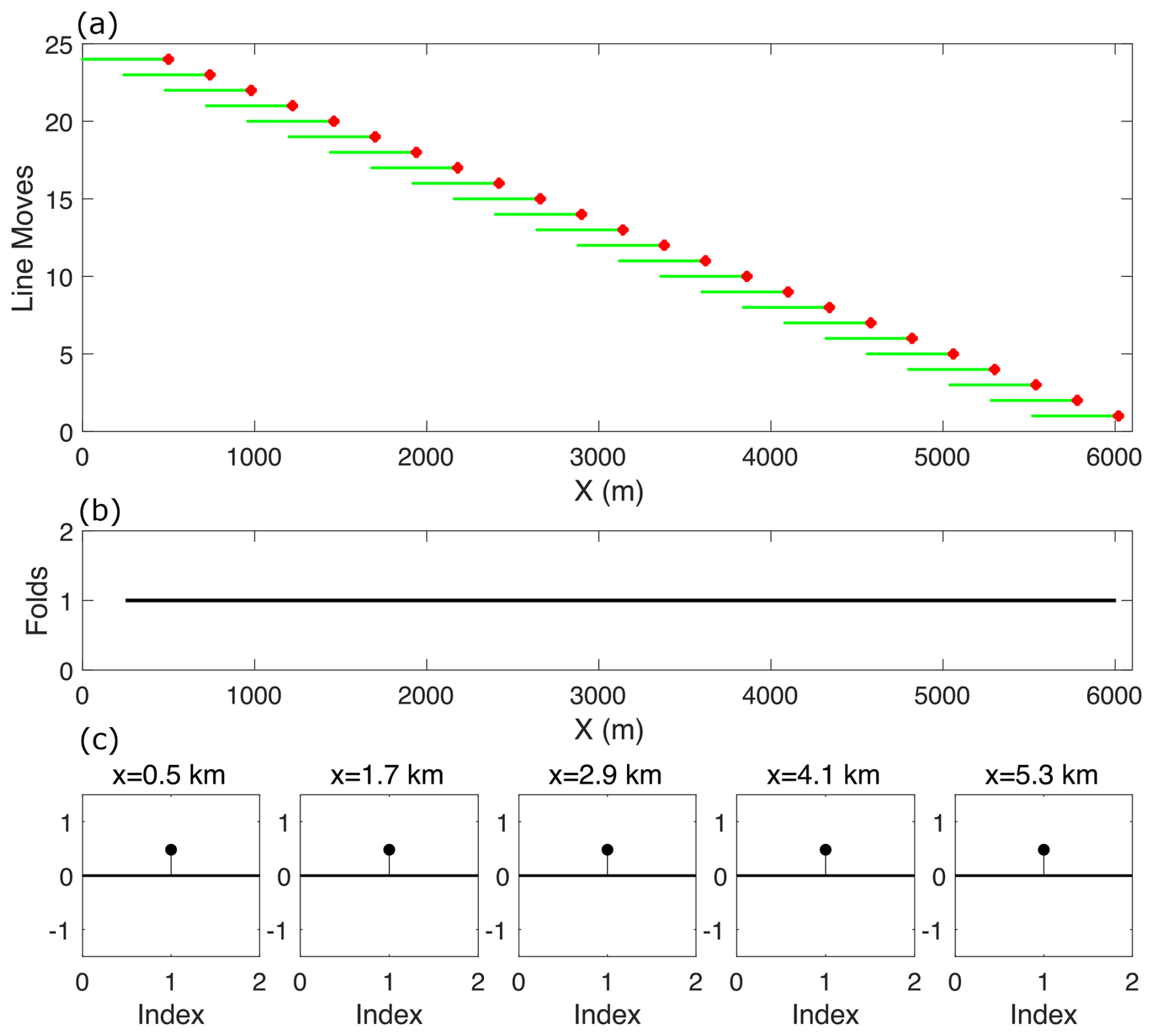Figure 21(a) Acquisition geometry of the CEC seismic line (e.g., Line A), with red stars denoting source positions and green dots indicating receiver locations. (b) Fold coverage of the survey. (c) Uniformity of offset distribution.