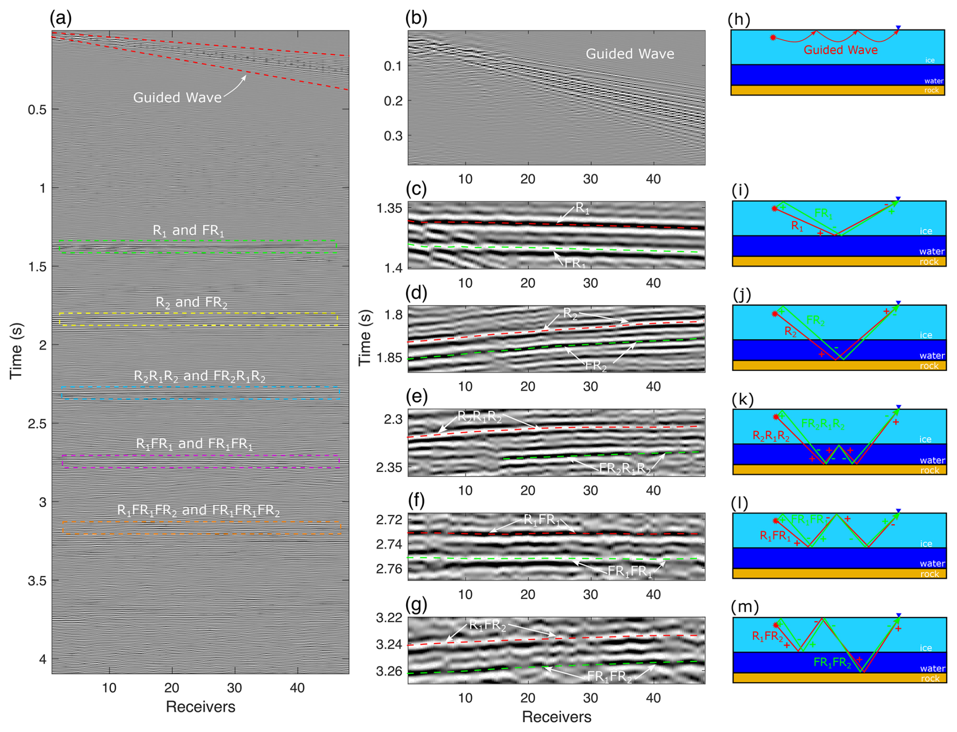 Figure 22(a) A single-shot seismic record acquired at the central part of Line A, showing prominent guided waves and multiple reflections. (b–g) Enlarged views of the red, green, yellow, blue, purple, and orange dashed boxes in (a), highlighting: (b) guided waves; (c) the primary ice–water reflection R1 and its source-side ghost FR1; (d) the primary lake-bed reflection R2 and corresponding ghost FR2; (e) the first-order water-layer internal multiple R2R1R2 and its ghost FR2R1R2; (f) the first-order free-surface multiple of the ice–water interface R1FR1 and its ghost FR1FR1; and (g) the free-surface multiple R1FR2 and its ghost FR1FR2. (h–m) Ray-path diagrams corresponding to the wave types highlighted in panels (b)–(g).
