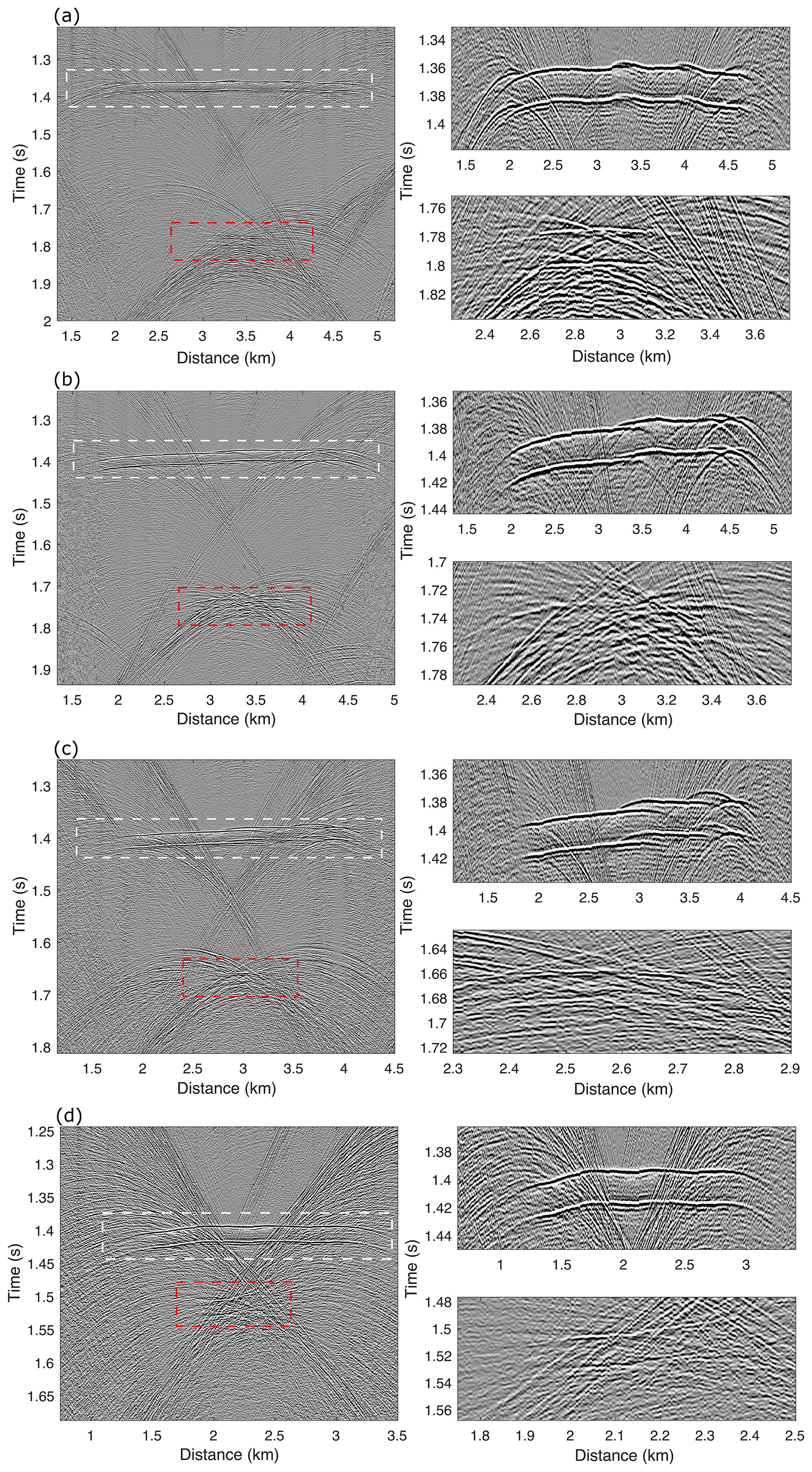 The seismic data were NMO-corrected using velocities of 3800 m s−1 for ice–water and 3650 m s−1 for lake-bottom reflections, then stacked to produce the sections shown in Fig. 23a–d for Lines A–D. Figure 24a–d present zoomed-in views: the first-column panels correspond to the red dashed boxes in Fig. 23a–d, while the second-column panels focus on the ice–water and lake-bottom interfaces. These stacked sections provide a well-resolved preliminary view of the ice–water and lake-bottom structures. However, several steeply dipping reflectors, visible in Fig. 23, intersect the ice–water and lake-bottom reflections. These off-line reflections, likely originating from the inclined margins of the subglacial lake, cannot be correctly repositioned by stacking, partially obscuring the true morphology of the lake boundaries. In addition, primary and multiple reflections observed in the common shot gather (Fig. 22) are better resolved in the stacked sections, with different reflection types indicated by white arrows in Fig. 23. The combination of mispositioned reflections and stacked multiples generates spurious structures that may obscure the true geology and complicate interpretation.