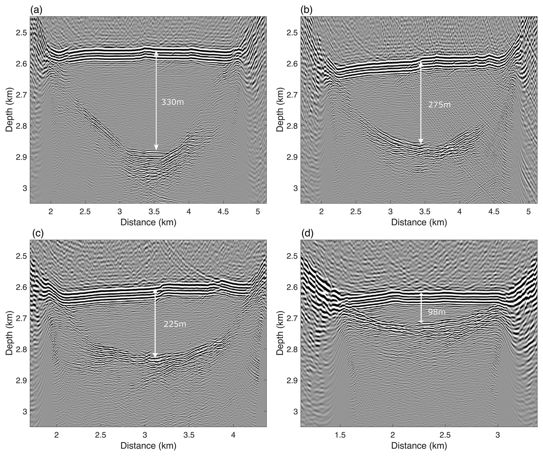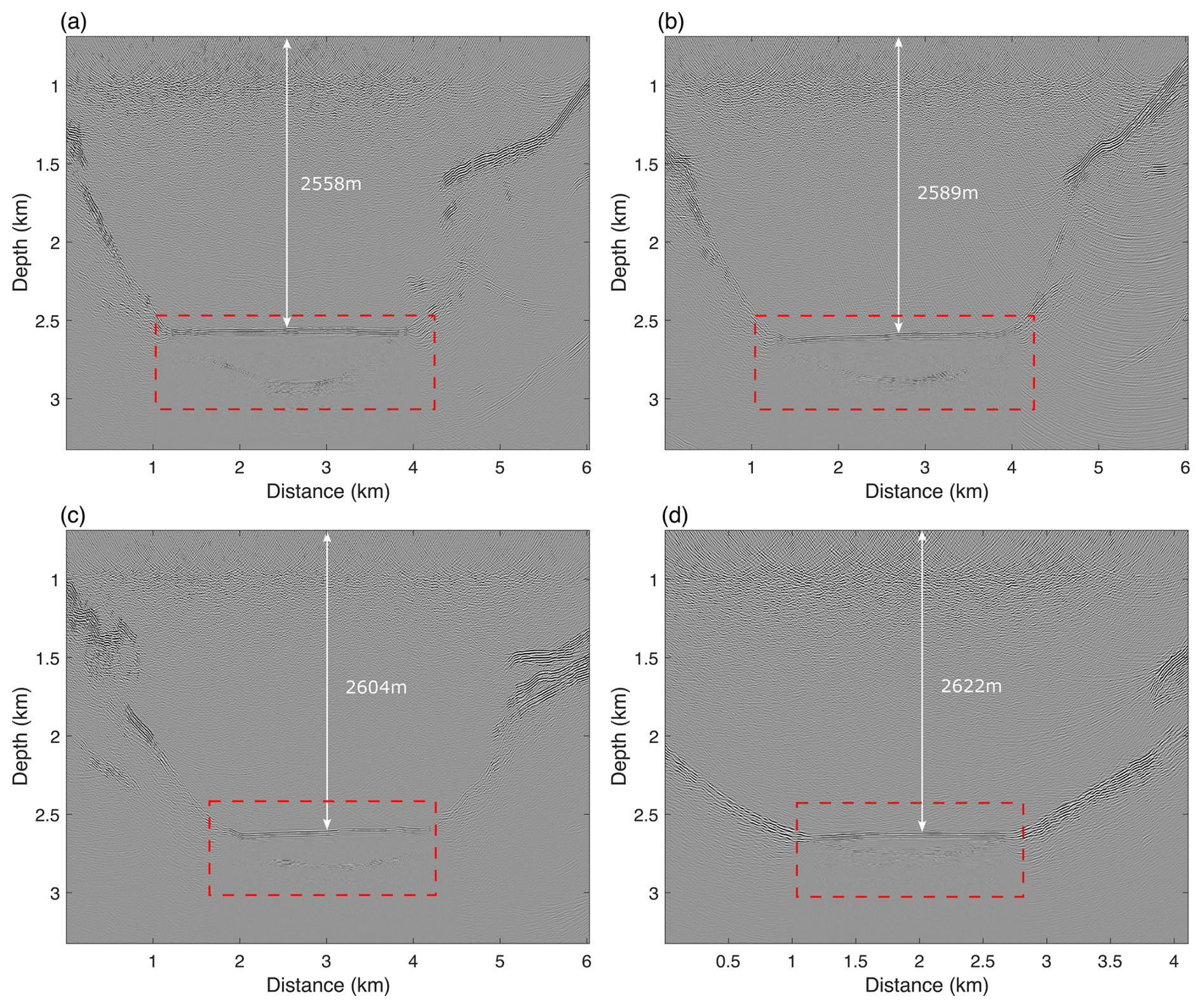 We applied the salt-flooding strategy described in Section 3.3 to migrate the seismic data from Lines A–D. (1) RTM was first performed on the prestack data using a constant velocity of 3800 m s−1 to delineate the ice–water interface. (2) The picked interface was then used to update the velocity model by assigning a velocity of 1500 m s−1 below the ice–water interface. (3) RTM was repeated with the updated model to generate the migration images for Lines A–D (Fig. 25a–d) . These migration results accurately depict the morphology of the CEC subglacial lake and clearly resolve the structural boundaries along its flanks. The ice–water interface deepens from ∼ 2558 m on Line A to ∼ 2622 m on Line D, indicating a progressive northwestward deepening of the lake. Meanwhile, the interface narrows from ∼ 2704 m on Line A to ∼ 1585 m on Line D, reflecting a progressive northwestward narrowing. Further, the migration images in Fig. 26 show that the water column thickness decreases from ∼ 330 m on Line A to ∼ 98 m on Line D, indicating a progressive northwestward thinning of the lake. It should be noted that reflectors in the migration sections consistently appear in pairs due to the imaging of source-side ghost events.