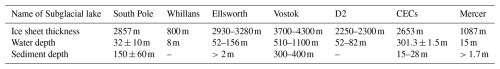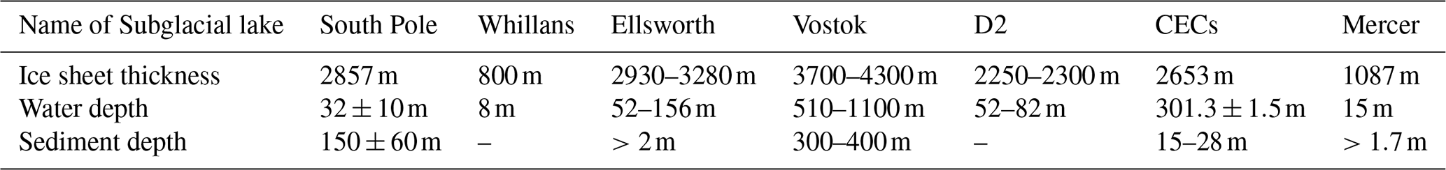 Table 1Summary of Documented Subglacial Lake Parameters (Peters et al., 2008; Woodward et al., 2010; Siegert et al., 2011; Horgan et al., 2012; Priscu et al., 2021; Brisbourne et al., 2023b; Ju et al., 2026).