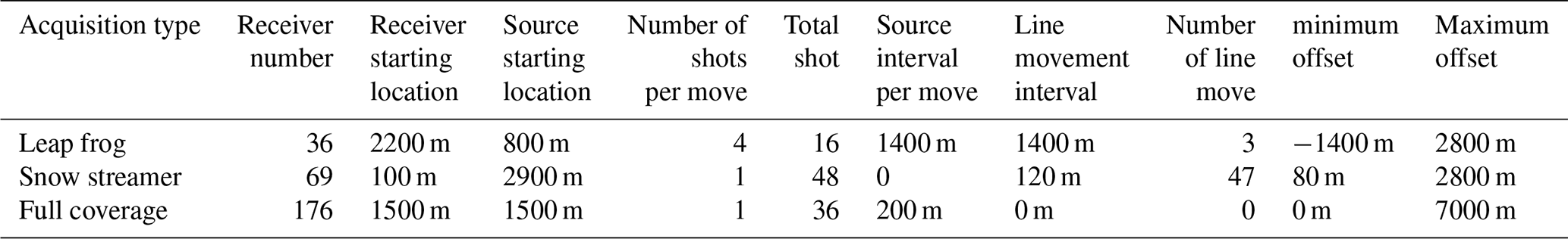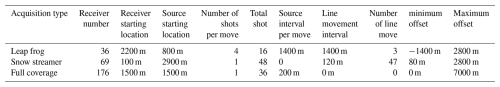 To compare the characteristics of the three acquisition systems, we simulated seismic surveys along a 10 km line for each system, with the specific parameters summarized in Table 2. Receiver spacing was set to 40 m, with survey coverage extending from x= 1500 to x=8500 m. The maximum offset was maintained at no less than 2.8 km, ensuring an offset-to-depth ratio of at least 1:1 (target depth 2.8 km), while the minimum offset was limited to 100 m. As shown in Table 2, the leap-frog system requires the fewest receivers, whereas the full-coverage system requires the most. Once deployed, the full-coverage array remains stationary throughout the survey, whereas the snow-streamer system requires the most frequent relocation. However, these acquisition parameters alone do not determine the actual field workload or operational challenges. In practice, factors such as the seismic-source type (e.g., vibroseis versus explosives), deployment methods for receivers and sources (surface-mounted versus buried), and local surface conditions (e.g., unconsolidated snow versus hard ice) and other factors also influence the practical effort and logistical demands of field acquisition. For example, although the snow-streamer system requires relatively more receivers and frequent line relocations (Table 2), its use in combination with gimbal-mounted geophones and a vibroseis source can achieve remarkably high acquisition efficiency. As reported by Smith et al. (2020), during the Ekström Ice Shelf survey, this configuration enabled a three-person team to acquire 20 km of seismic line in a single day.