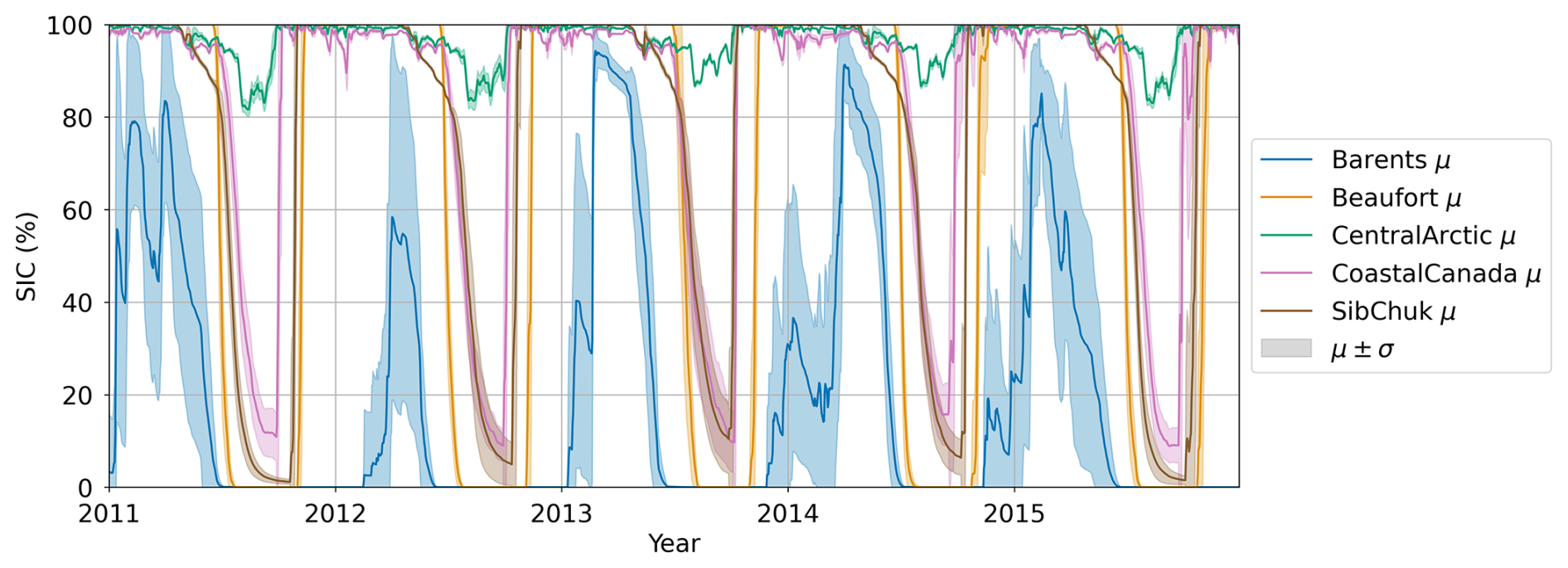 Figure 2Mean (μ) and standard deviation (±σ) of SIC across ensemble members and region of the Icepack free-run for 2011–2015.