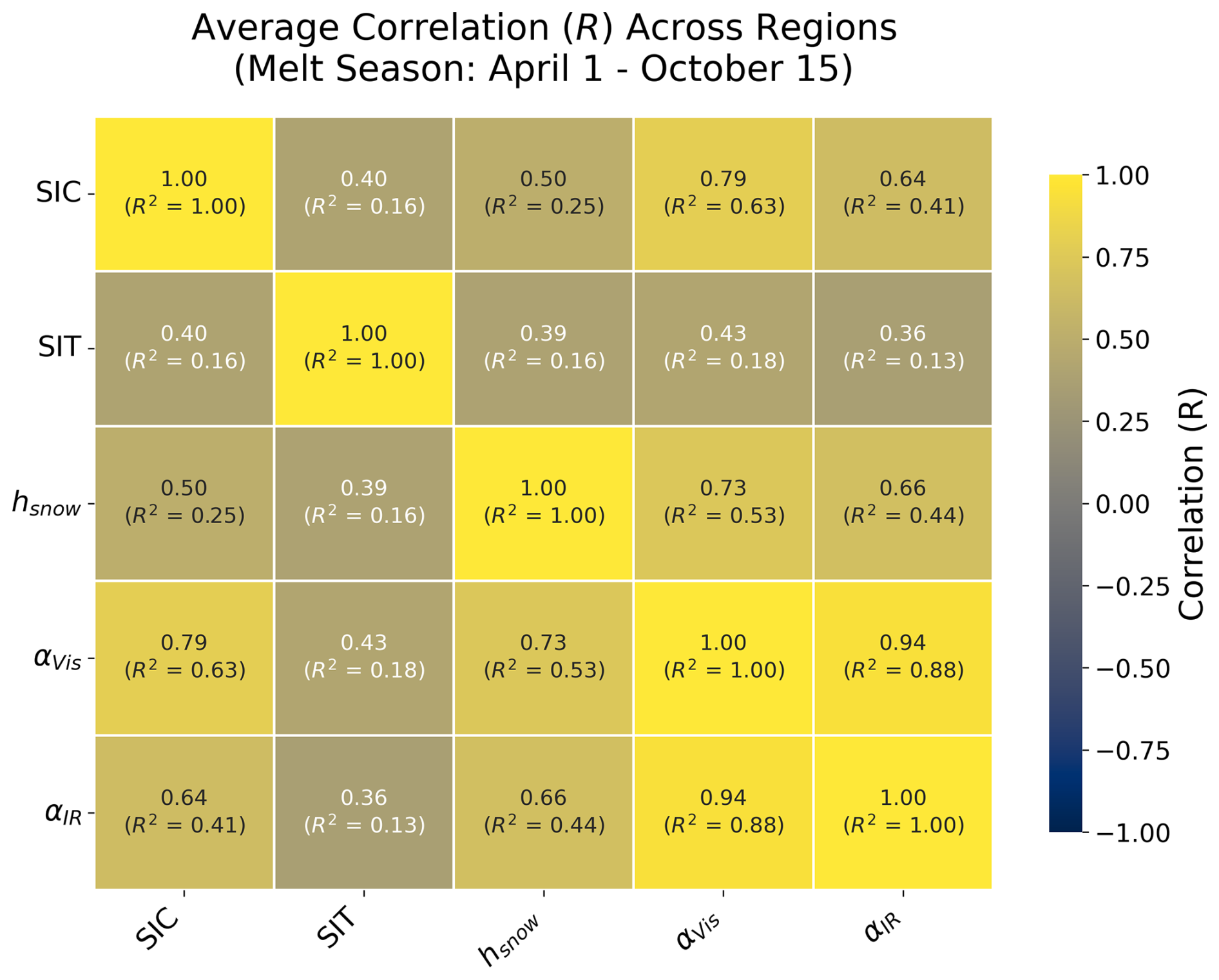 We begin by examining the relationships among all Icepack aggregate variables of interest across all regions to assess their uniqueness and find where there is overlap over the melt season that we defined as 1 April–15 October (Fig. 3). We find that many variables are strongly correlated with each other. In particular, SIAL is well correlated with SIC but less so with SIT.