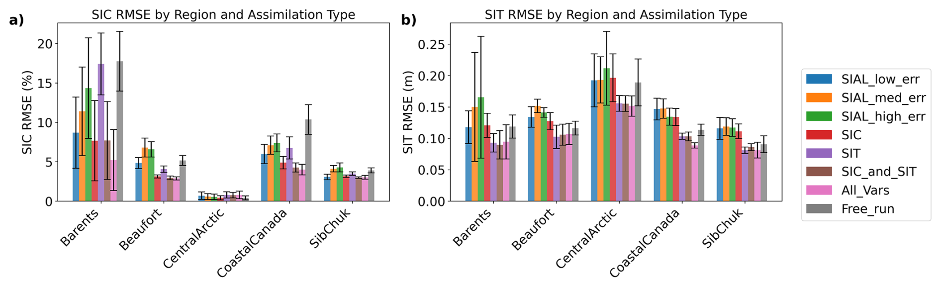We calculate the ensemble mean (μ) RMSEs for SIC and SIT relative to eleven distinct TRUTH simulations, each based on a different randomly selected ensemble TRUTH member, for multiple assimilation experiments: SIAL-only (at low, medium, and high uncertainty levels; see the Methods section), SIC-only, SIT-only, SIC and SIT, all-variable assimilation (with low SIAL uncertainty), and a control free-run (Fig. 4). Error bars represent 95 % confidence intervals around the mean RMSE, calculated across 11 TRUTH simulations (ensemble members 3, 5, 8, 10, 12, 14, 16, 19, 21, 25, and 28) using bootstrap resampling.