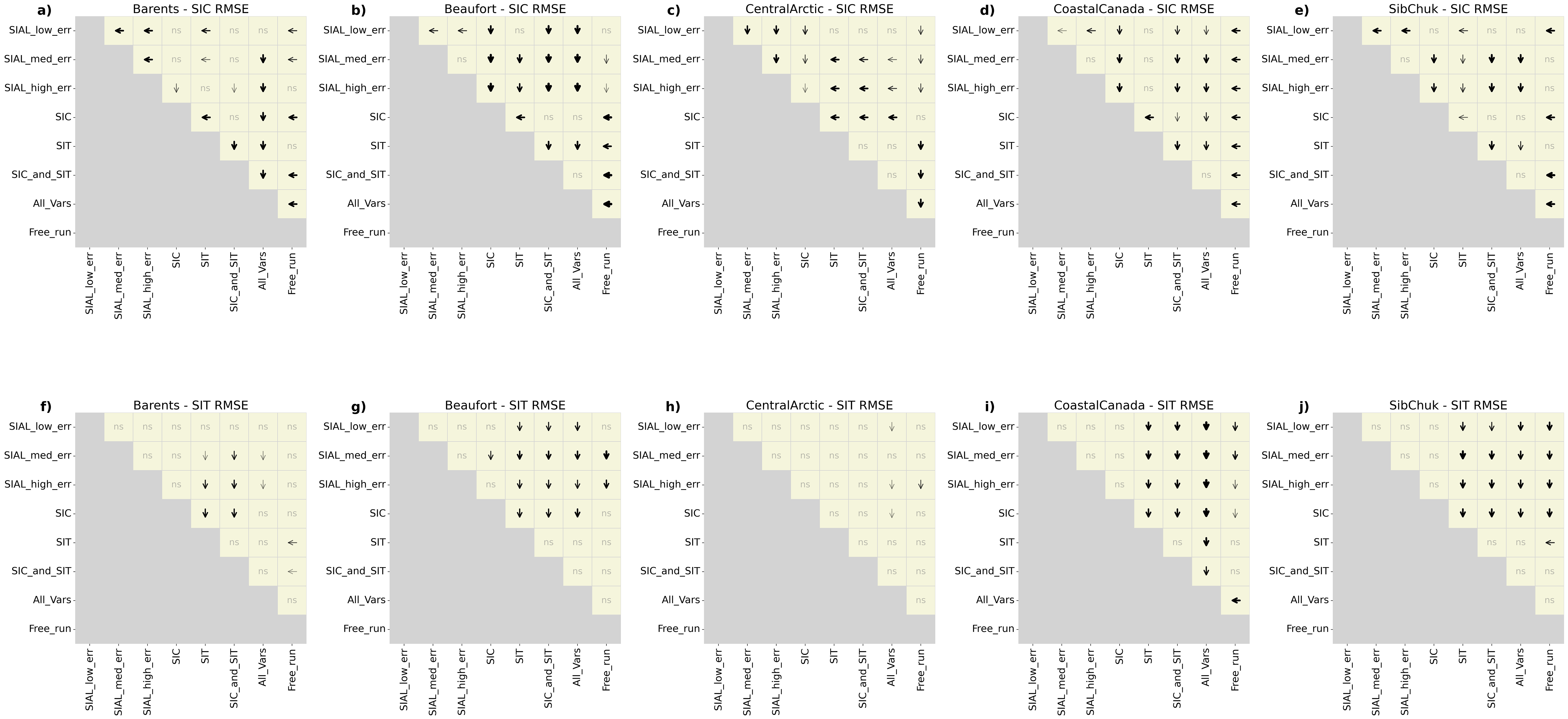 Figure 5Pairwise statistical comparison of RMSEs (relative to the TRUTH) for different assimilation experiments across five regions for SIC (a–e) and SIT (f–j). Arrows indicate statistically significant differences (p<0.05), pointing toward the assimilation experiment with lower RMSE; arrow thickness increases with statistical confidence (smaller p-values). The label “ns” denotes non-significant comparisons. For example, in the top left tan square of panel (a), the arrow points from medium-uncertainty SIAL assimilation toward low-uncertainty SIAL assimilation in the Barents Sea, indicating that the latter achieves significantly lower SIC RMSE relative to the TRUTH. Assimilation cases include SIAL (low, medium, and high uncertainty), SIC, SIT, SIC and SIT, all variables (with medium SIAL uncertainty), and a free-run control. Exact p-values are provided in Table S1.