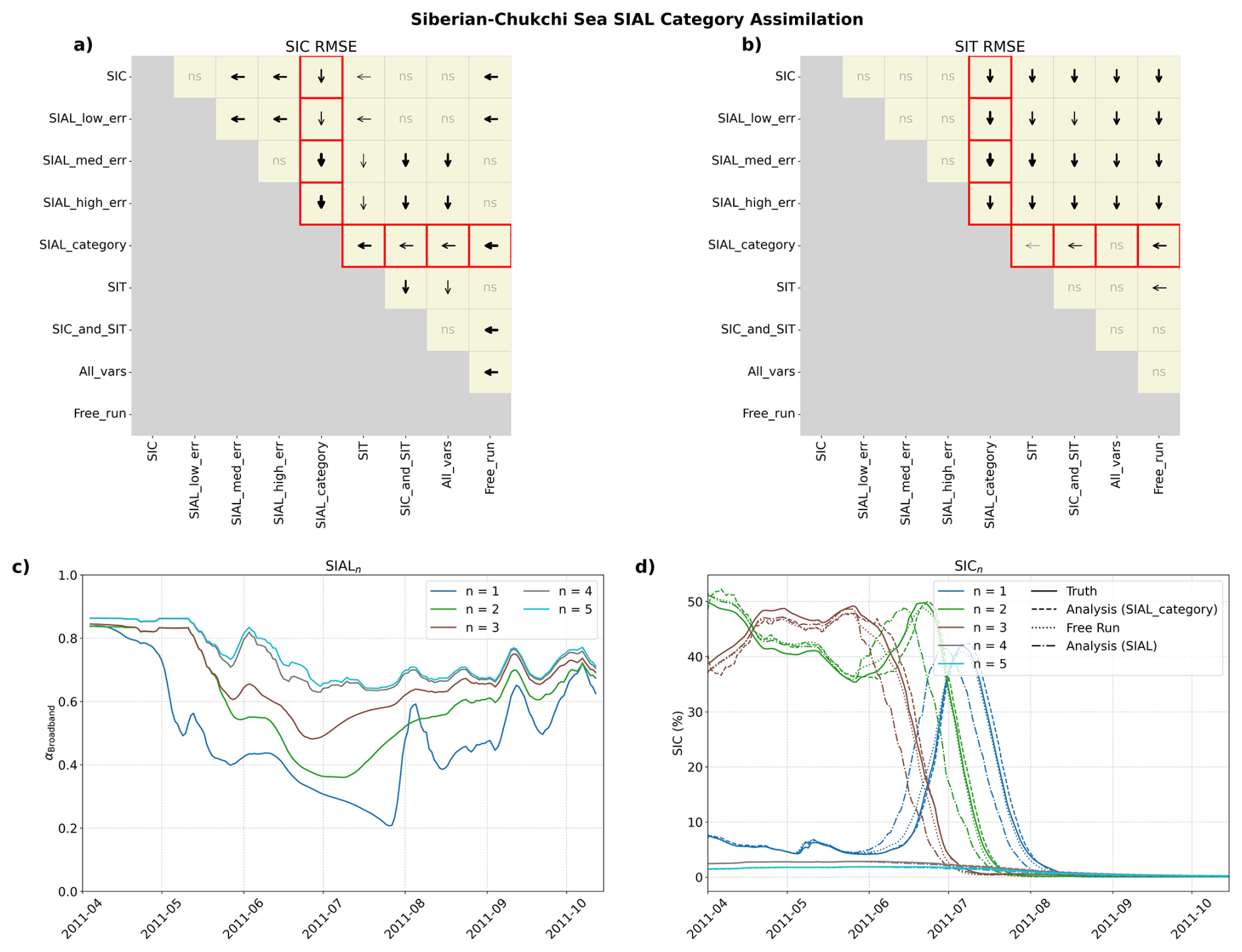 Figure 7Siberian-Chukchi Sea results for the SIAL category-wise assimilation experiment. (a) Pairwise statistical significance of differences in mean RMSE for SIC among assimilation configurations. Black arrows indicate statistically significant differences in RMSE between assimilation configurations (p<0.05), pointing toward the experiment with lower RMSE relative to the TRUTH. “ns” denotes differences that are not statistically significant. Red boxes highlight comparisons between SIALcategory and all other assimilated variables and uncertainties. (b) As in panel (a) but for SIT RMSE. (c) Time series of domain-averaged broadband albedo (αbroadband) for eleven SIAL ensemble mean thickness category members (n=1 to 5). (d) Corresponding time series of mean SIC (%) for the same eleven ensemble members, including TRUTH, free run, and analysis under category members (n=1 to 5).