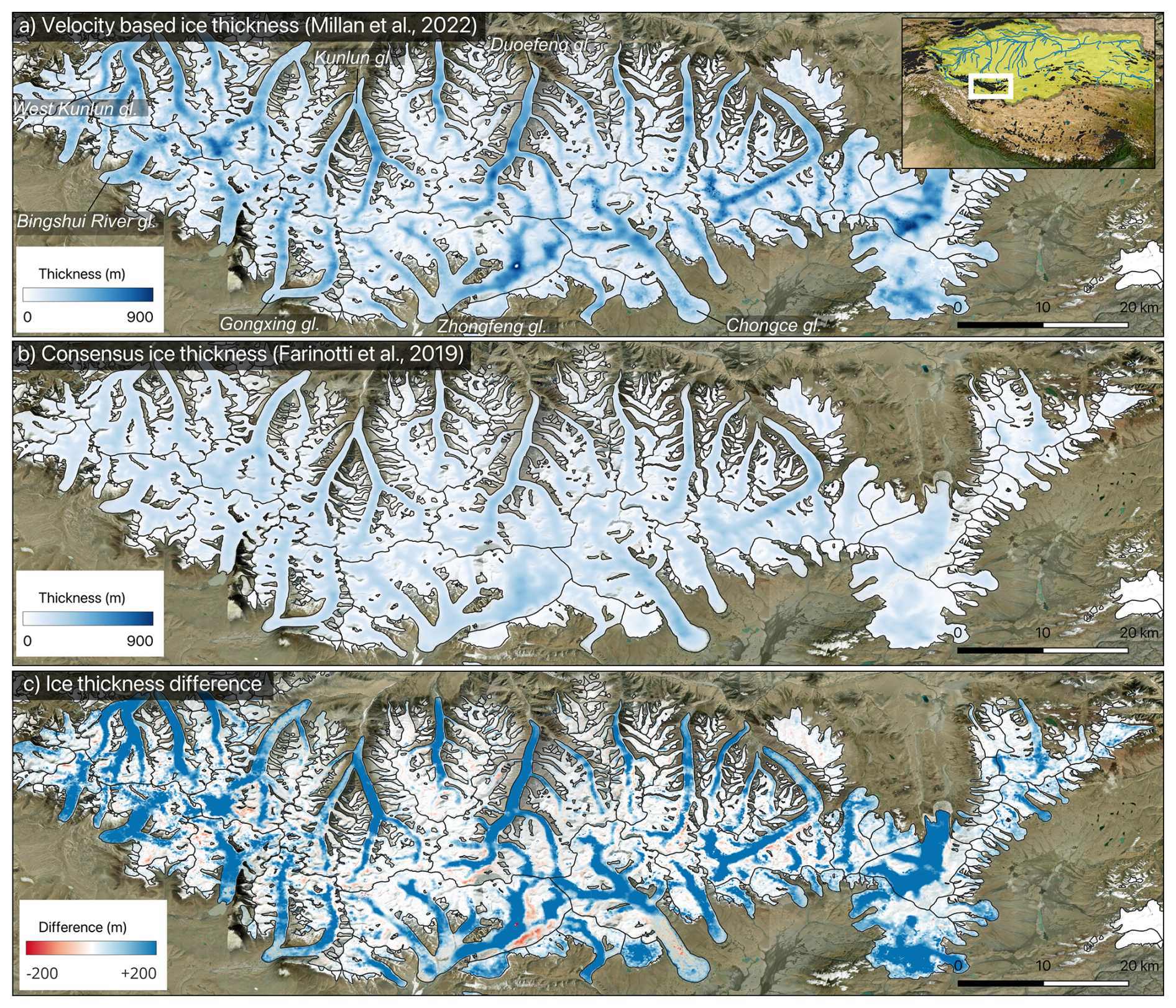 In this paper, we focus on differences within a sub-region of the Western Kunlun Mountains. The consensus model corresponds approximately to the year 2000: the selected glaciers' RGI outlines are from 2010, but FARI19 used the 2000–2001 SRTM DEM for thickness inversions in this region. Since Millan et al. (2022) relies on ice velocities centered on 2017–2018, we corrected the MIL22 estimates to obtain thicknesses corresponding to the year 2000. As correction, we simply subtracted average glacier thickness changes of Hugonnet et al. (2021) between 2000 and 2019, which is obtained from DEM differencing, to MIL22 thicknesses. While solving temporal ambiguities of the thickness models is complicated, since DEM sources and in-situ data are not properly dated, this correction may be a step toward roughly matching the timing of the consensus estimate. After correction, differences in glacier mass change average about 6 km3 compared to the original MIL22 estimate, representing 1 % of the latter. Finally, the ice volume totals 345 km3 and 570 km3 for FARI19 and corrected MIL22 respectively (Fig. 1c). It is worth noting that in general, ice thickness is systematically higher for MIL22 than for Farinotti, both at low and high elevations (Fig. 1c), with differences reaching up to 200 m along glacier trunk.