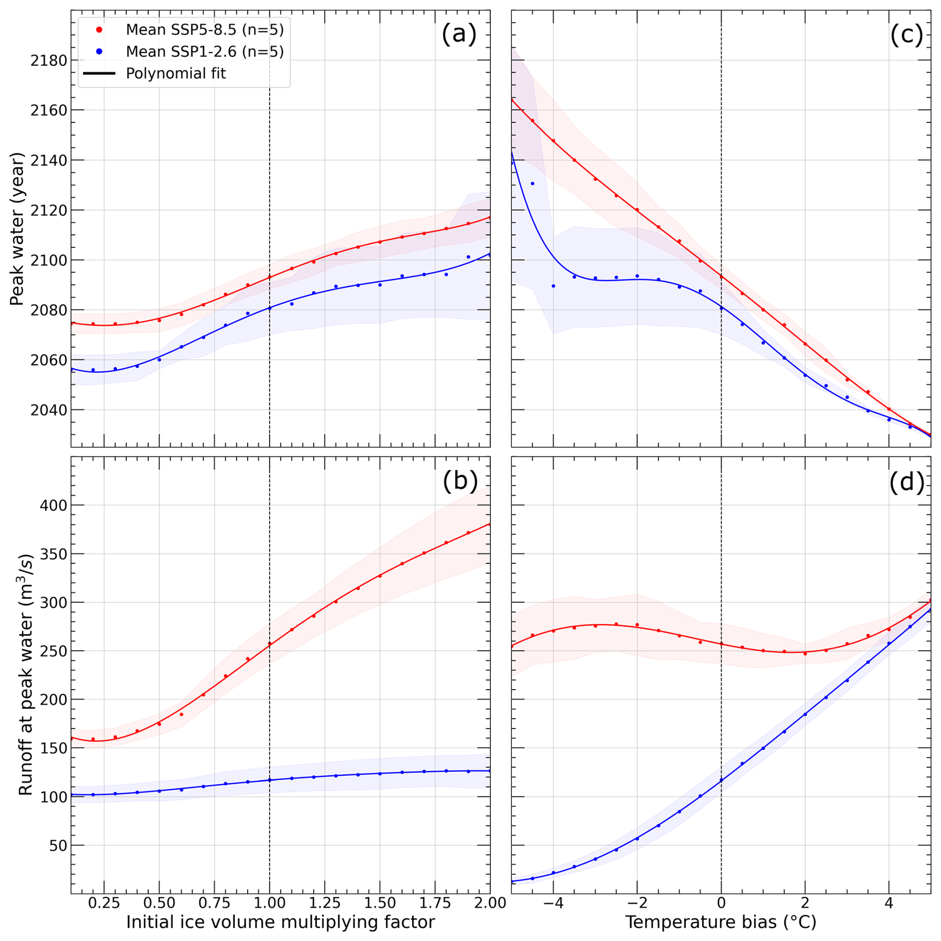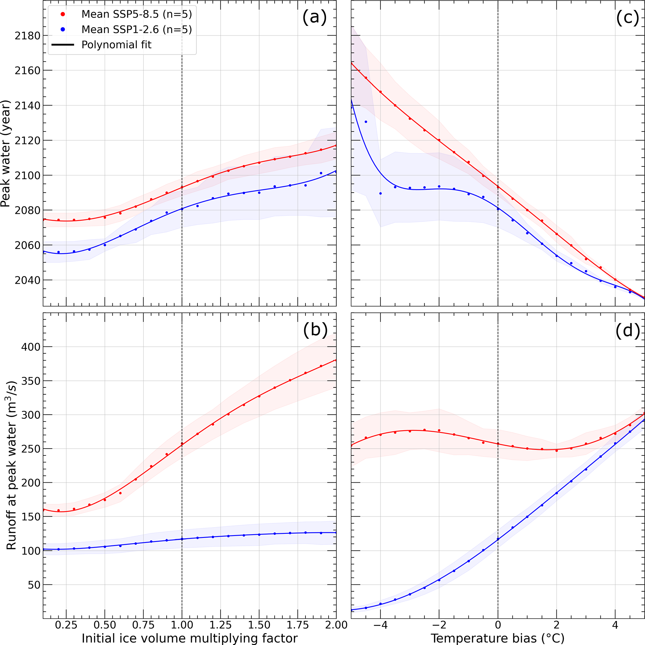 Figure 2Timing and runoff at peak water for varying initial ice volume fractions (a–b) and temperature biases (c–d). All of these simulations have been carried out using ice thickness data from MIL22. Results are presented only for SSP-1.2.6 and SSP-5.8.5 (few differences are visible between SSP1.2.6 and SSP5.3.4-OS) with multi-GCM mean shown in bold and shading indicating the mean ±1 standard deviation of the GCM ensemble.