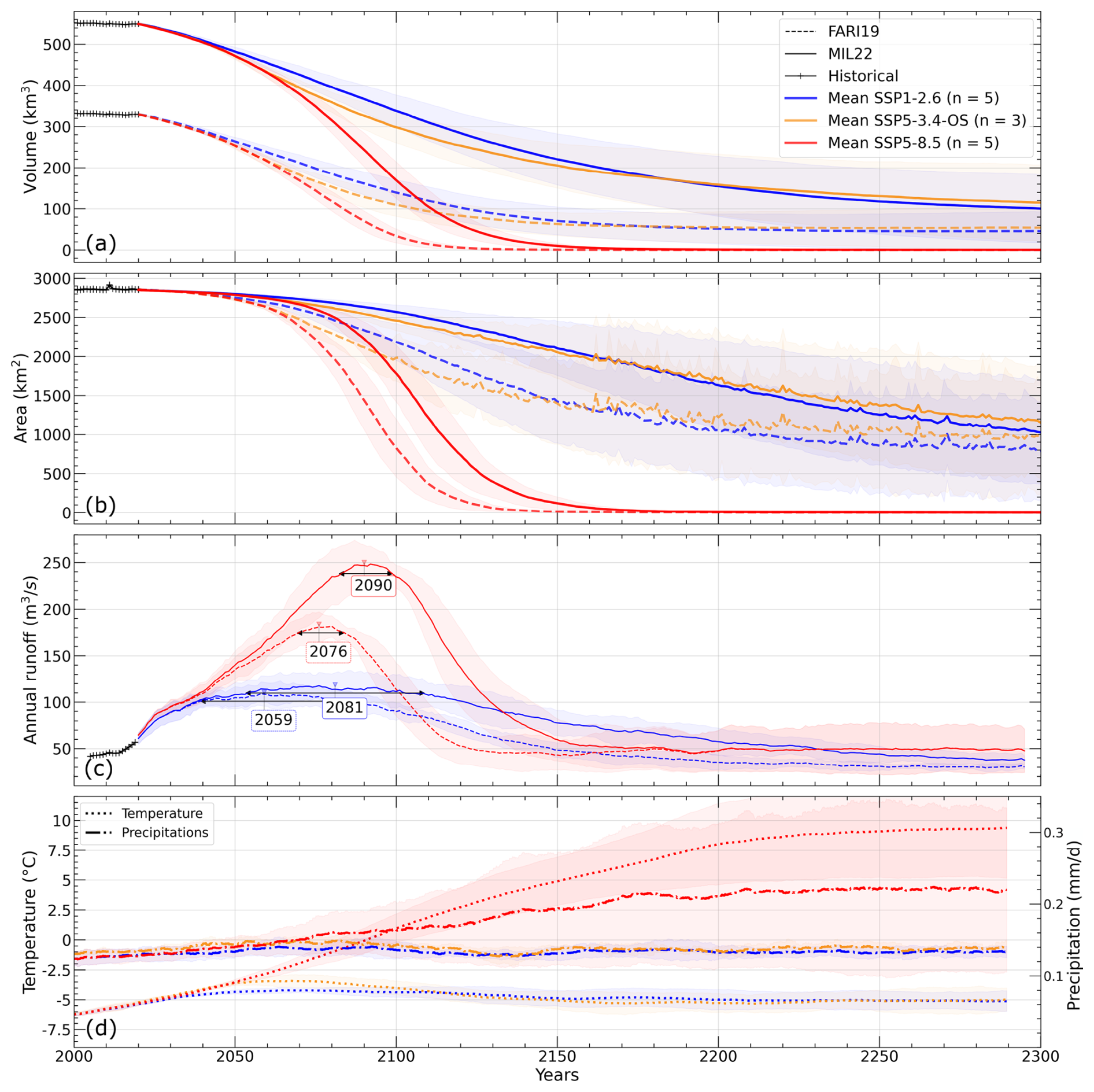 As glaciers lose mass, we can also see their surface area receding. The regional glacierized surface area ( 2850 km2 at the beginning of simulations) slowly decreases until trends start to differ between climate scenarios around 2045 (Fig. 3b). The glacierized area of the consensus decreases at a faster rate than the one of MIL22 for SSP1-2.6 with a loss of  13 km2 yr−1 against  7 km2 yr−1 in average for the 2050–2150 time period. Hence, in 2300 FARI19 and MIL22 areas have declined by 72 % and 63 % respectively. Curves based on the SSP 5-8.5 still stand out with a higher loss rate, which is very similar for FARI19 and MIL22, averaging  27 km2 yr−1 during 2040–2150, before most glaciers disappear completely. Indeed, while in 2150 there is still a total glacierized area equivalent to 114 and 12 km2 for MIL22 and FARI19 respectively, less than 2 km2 remain in 2300 for both datasets. As a brief aside, it should be noted that the visible increase in glacier area variability after 2160 reflects a known OGGM limitation, that arises from the use of a trapezoidal bed and the absence of a ice–snow distinction among others.