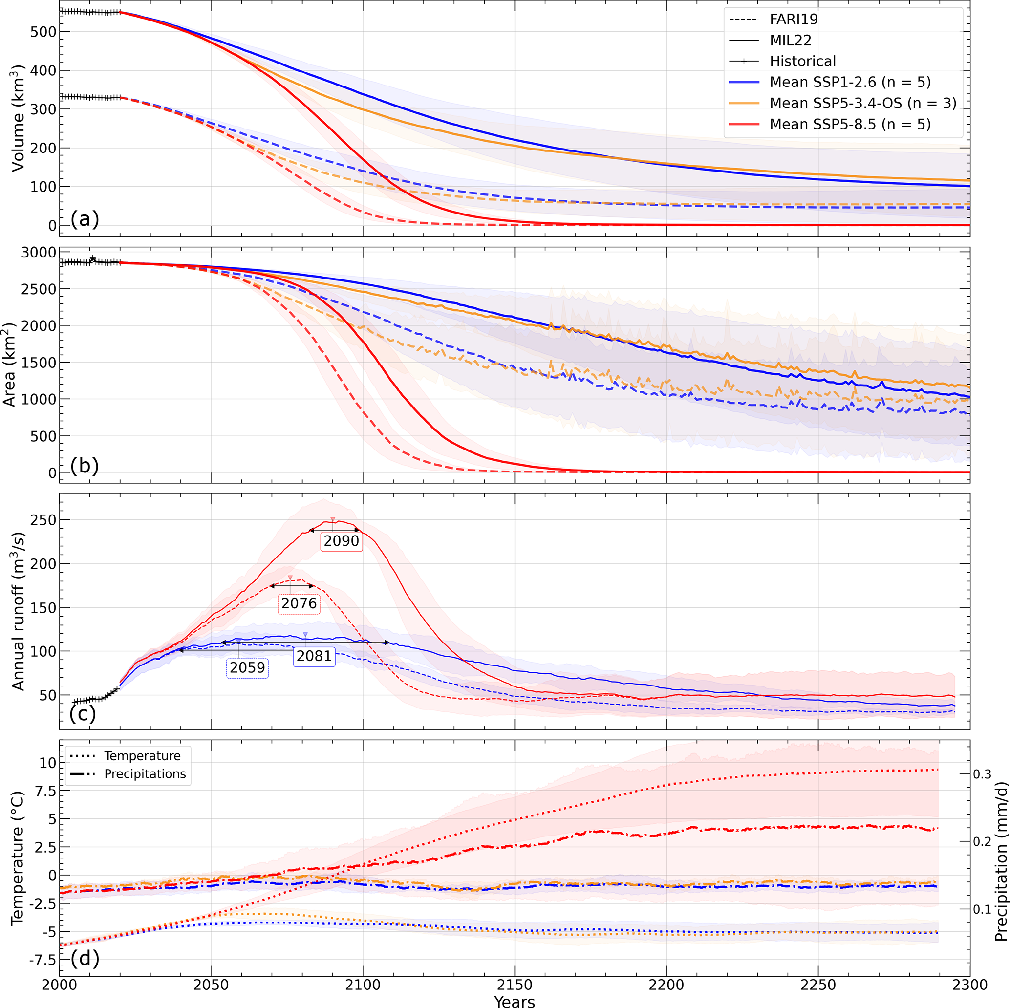 In response to such changes in glaciers characteristics, glacier hydrological contributions are also modified along the decades. Here, we present simulated annual runoff averaged over a 11-year window for better readability (Fig. 3c); for the same reason, we do not show simulations forced with SSP5-3.4-OS on this figure, but they are included in Fig. S2. Runoff starts at the same level for the two datasets, being around 45 m3 s−1, since the initial glacier surface area is identical for all simulations. Under SSP1-2.6, after the first decades of simulation, FARI19 annual runoff goes from 45 to 105 m3 s−1 in year 2059. The plateau around this “peak” lasts approximately 40 years before glaciers runoff slowly diminishes until reaching a runoff of 30 m3 s−1 in 2240 and remaining constant for the last five decades of simulation. MIL22 runoff also rises from 45 to 115 m3 s−1, with a peak located in year 2081 and a plateau of more than 50 years, and then declines during the following decades. In the year 2290, the runoff value is less than 40 m3 s−1. Under SSP5-3.4-OS, FARI19 annual runoff reaches peak water at 125 m3 s−1 in 2056, while it is assessed at 135 m3 s−1 in 2061 using MIL22. In both cases, runoff declines after a plateau lasting 25–30 years depending on the dataset, before going below runoff levels of SSP1-2.6 (Fig. S2). Under SSP5-8.5, annual runoff increases steadily until reaching a peak of 180 m3 s−1 in year 2076 for FARI19. For MIL22, runoff increases to a peak of almost 250 m3 s−1 in 2090. In both cases, the plateau lasts 10–15 years (Fig. 3c). Then, the two annual runoff curves decline with an offset in time, and an average runoff difference of  40 %. This difference becomes smaller before fading away completely around 2190, when glaciers shrank so much that runoff is from now on almost entirely composed of snow melt and liquid precipitation on ice-free areas as indicates the evolution of annual runoff decomposed by its four different contributions (Fig. S1). The latter highlights that under SSP1-2.6 and after 2200, runoff is mostly sustained by snow melt of ice-free areas with FARI19, whereas ice melt on glacier remains the largest component with MIL22. Under SSP5-8.5 annual runoff is largely due to precipitation on ice-free areas with both datasets. Trends in runoff also highlights an abrupt change in the runoff component related to snow and ice melt on glacier around 2020 at the transition between historical and projection estimates (Figs. 3, S1), also reported in other studies (Aguayo et al.2024). This is likely due to discrepancies in climate data between the historical and projections periods, and more specifically in the precipitations estimates (see Fig. S3). Because the mass-balance model parameters are calibrated on the historical period, substantial differences may prevent the model from being properly adjusted to future climate conditions. Glaciers runoff projections are indeed influenced by uncertainties in reference climate conditions and calibration choices (Schuster et al.2023; Aguayo et al.2024).