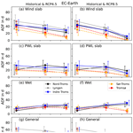 To investigate potential future changes of the APs, we consider the NorCP downscalings based on the EC-Earth climate model for the historical as well as RCP4.5 and RCP8.5 scenarios (Fig. 9). We find that results based on the NorCP downscaling of the GFDL-CM3 RCP8.5 scenario are generally similar to the corresponding EC-Earth-based simulations, as can be seen in Fig. S9. The significance of the changes of the ADF between historical, mid-century, and late century is tested with a Monte-Carlo simulation. The procedure is described in Appendix B. The numerical changes and their statistical significance are shown in Figs. S10–S13.