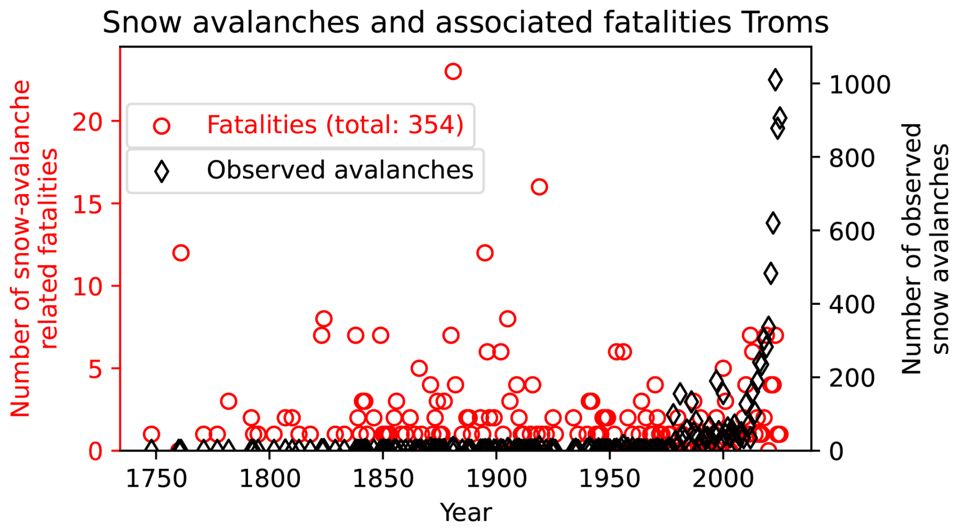 Figure 1Time series of snow-avalanche related fatalities (red) and observed snow avalanches (black) in Troms county, Norway. The data are provided by the Norwegian Water Resources and Energy Directorate (NVE) and can be downloaded from https://nedlasting.nve.no/gis/ (last access: 5 August 2025).