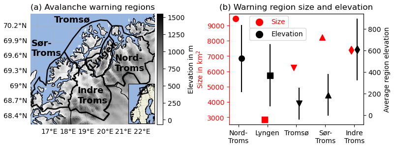 Figure 2(a) Study region with NORA3 topography information and the borders of the individual warning regions (the figure is adapted from Fig. 1 in Eiselt and Graversen, 2025). (b) The size (red) of each warning region in km2 and the average elevation (black) of each study region, including the standard deviation indicated by the error bars.