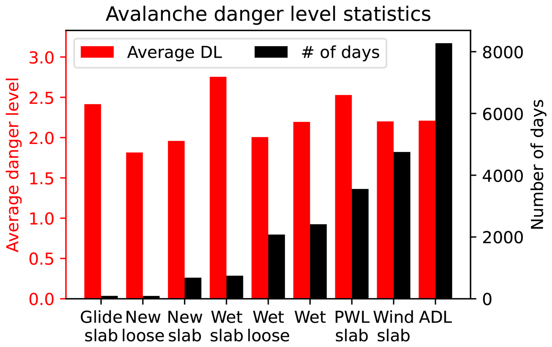 Figure 3Average danger level per avalanche problem (AP; red) and the number of days on which the AP was identified by the forecasters (black) in northern Norway. The average danger level was calculated only for the days the specific AP was identified. The ADL (avalanche danger level) on the x axis refers to the general avalanche problem. The data cover the period from winter 2016/2017–2024/2025 for the general avalanche problem and 2017/2018–2024/2025 for the other APs.