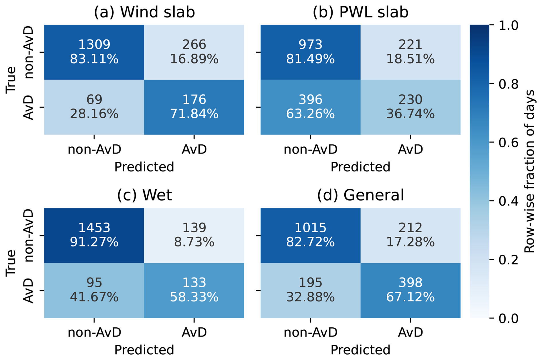 Figure 4Confusion matrices for the random forest models trained for the different avalanche problems: (a) wind slab, (b) PWL slab, (c) wet snow, as well as (d) the general avalanche problem. The abbreviations AvD and non-AvD mean avalanche day and non-avalanche day, respectively. The colour and percentages indicate the row-wise fraction of the number of days.