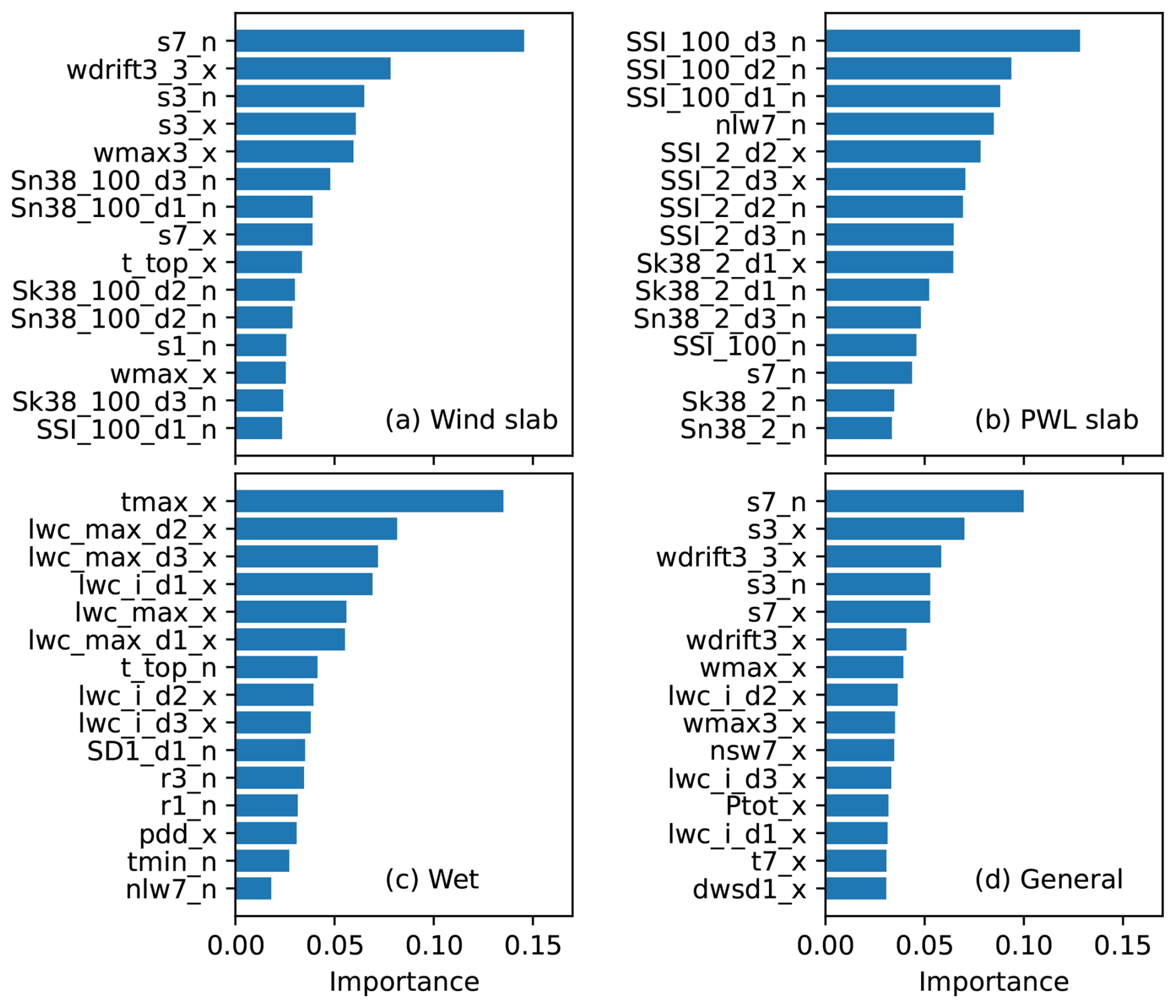 Figure 5The fifteen most important features and their feature importances for the random forest models for the different avalanche problems: (a) wind slab, (b) PWL slab, (c) wet, as well as (d) the general avalanche danger. See Tables C1 and C2 in Appendix C for descriptions of the predictive features.