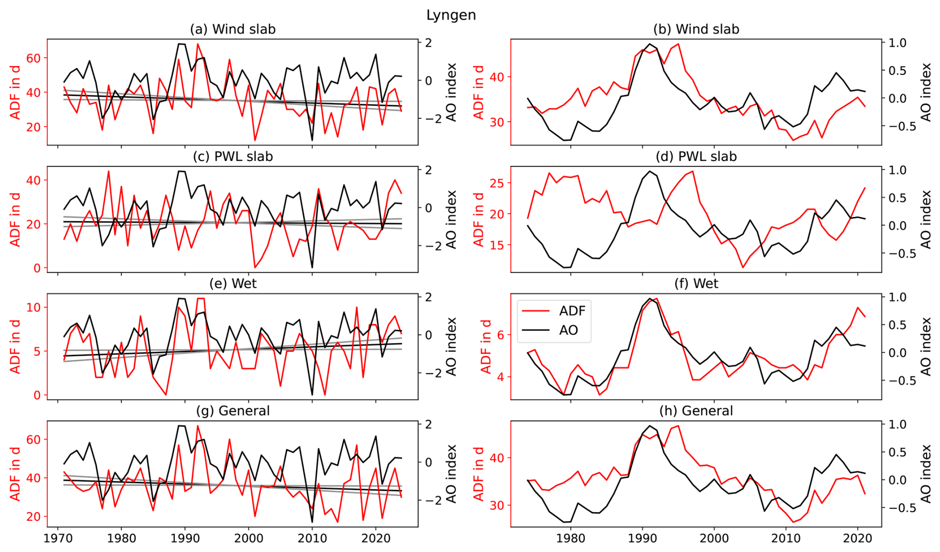 Figure 6Winter (December–February) avalanche-day frequency (ADF; red) and Arctic Oscillation (AO) index (black) from 1970–2024 based on NORA3 data for (a, b) wind slab, (c, d) PWL slab, (e, f) wet, and (g, h) general avalanche problem for (left panels) annual and (right panels) 7 years rolling means in the warning region Lyngen. The straight black and gray lines indicate the linear trends and their uncertainties. Note the different y axis scales for the different avalanche problems. For the corresponding correlation coefficients of AO and ADF see Fig. 8 and Table S2 in the Supplement.
