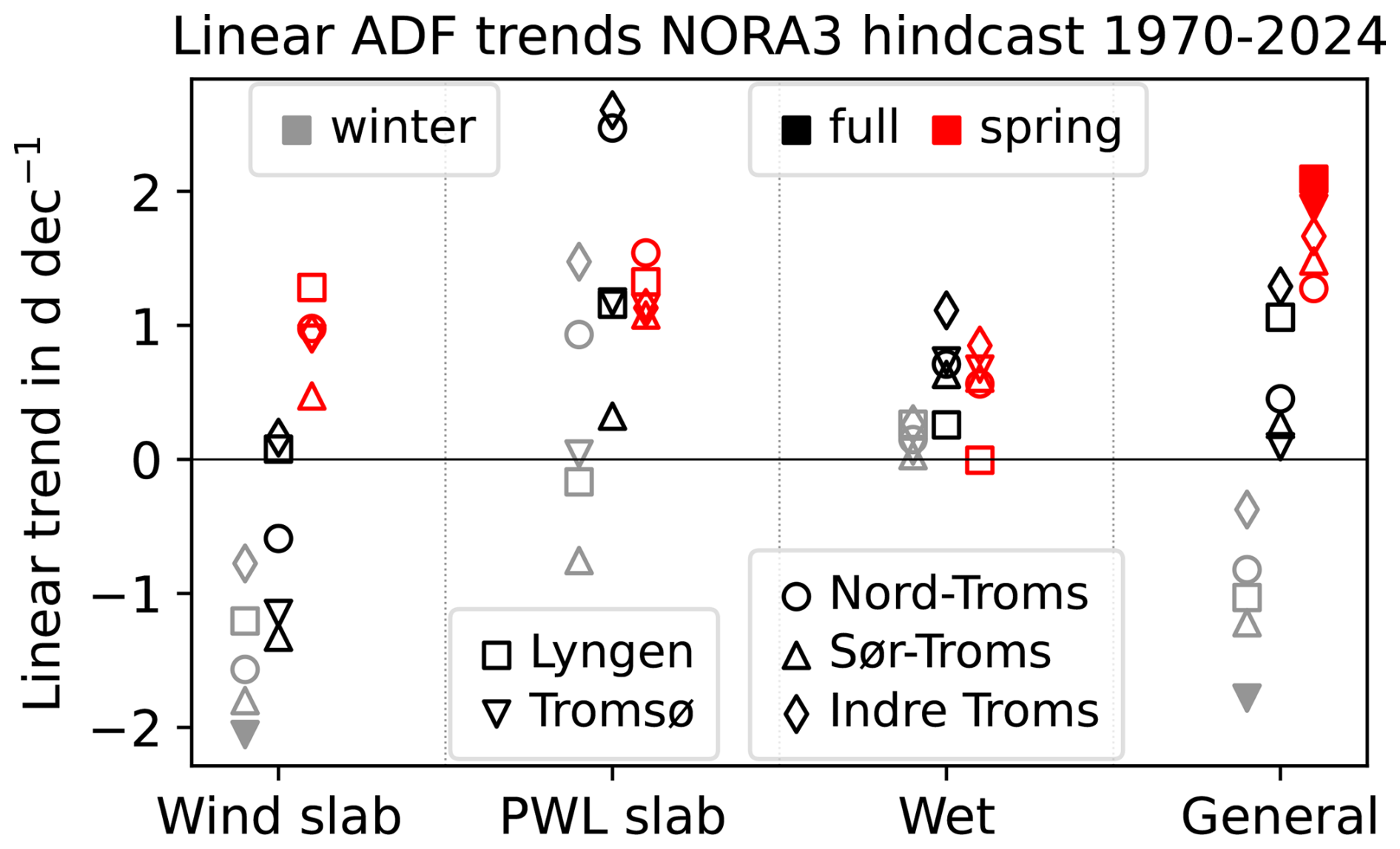 We first consider linear trends of the ADF over the whole NORA3 period (1970–2024). The values of the trend slopes are depicted in Fig. 7 (see also the straight lines in Fig. 6 for Lyngen) and the regression coefficients (Pearson R) are shown in Table S1.