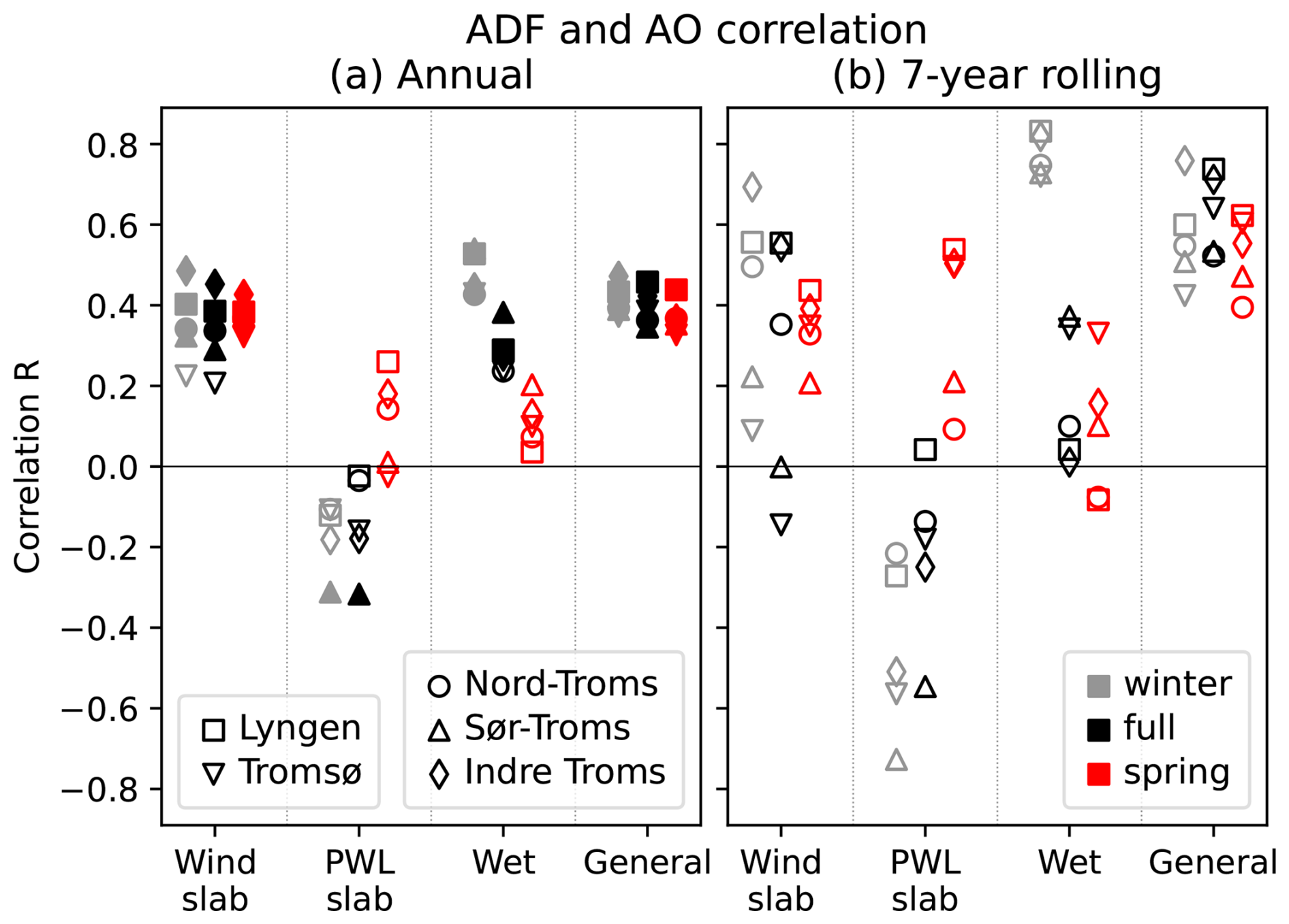 Figure 8Correlation coefficients (Pearson R) between (a) annual and (b) 7 years rolling mean avalanche-day frequency (ADF) and Arctic Oscillation (AO) index for all seasons, regions, and avalanche problems. Filled markers in (a) indicate statistical significance at p<0.05. The values are also shown in Table S2.