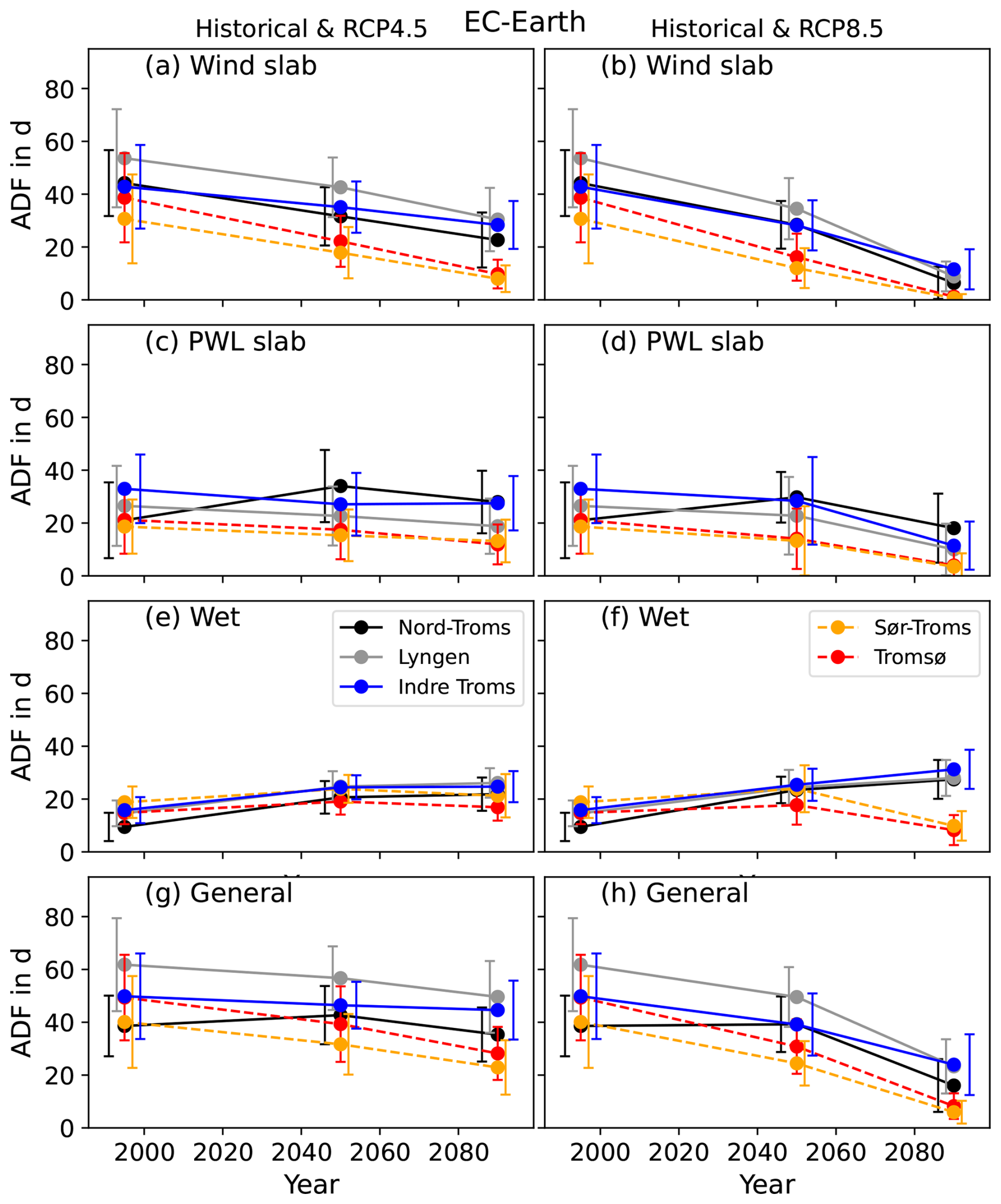 The main result is that the ADF in northern Norway declines over the 21st century for all APs, except for the wet-snow AP, which in fact exhibits an increase for the high-elevation regions (Nord-Troms, Lyngen, Indre Troms). We present the results in more detail below, focusing first on RCP4.5, followed by RCP8.5.