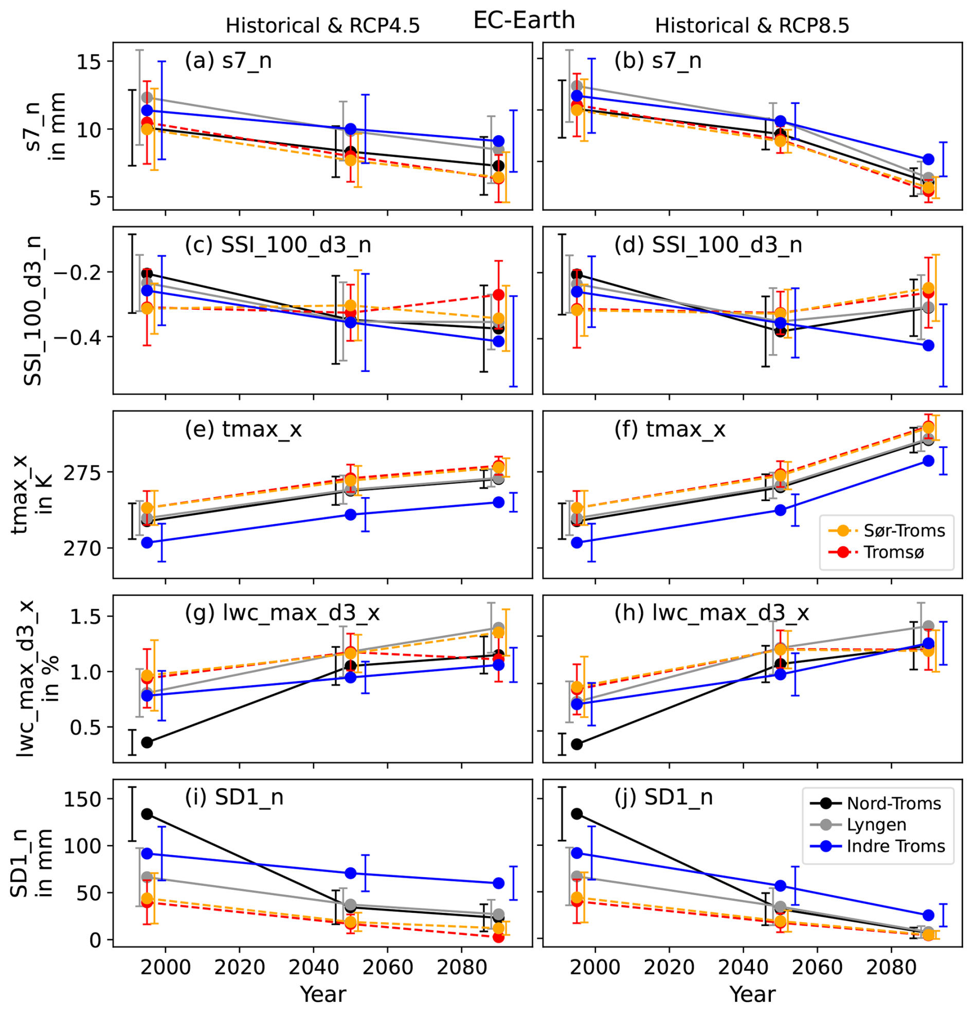 Figure 11NorCP- and SNOWPACK-derived predictive features for the EC-Earth RCP4.5 (left panels) and RCP8.5 (right panels) simulations. Shown are the averages (dots) of the three 20 years periods 1985–2005 (historical), 2040–2060 (mid-century), and 2080–2100 (late century). The errorbars indicate the standard deviation over the 20 years periods. The errorbars are slightly horizontally shifted for better readability. The different colours represent the different individual warning regions. For the feature definitions see Sect. 2.5 and Tables C1 and C2 in Appendix C.