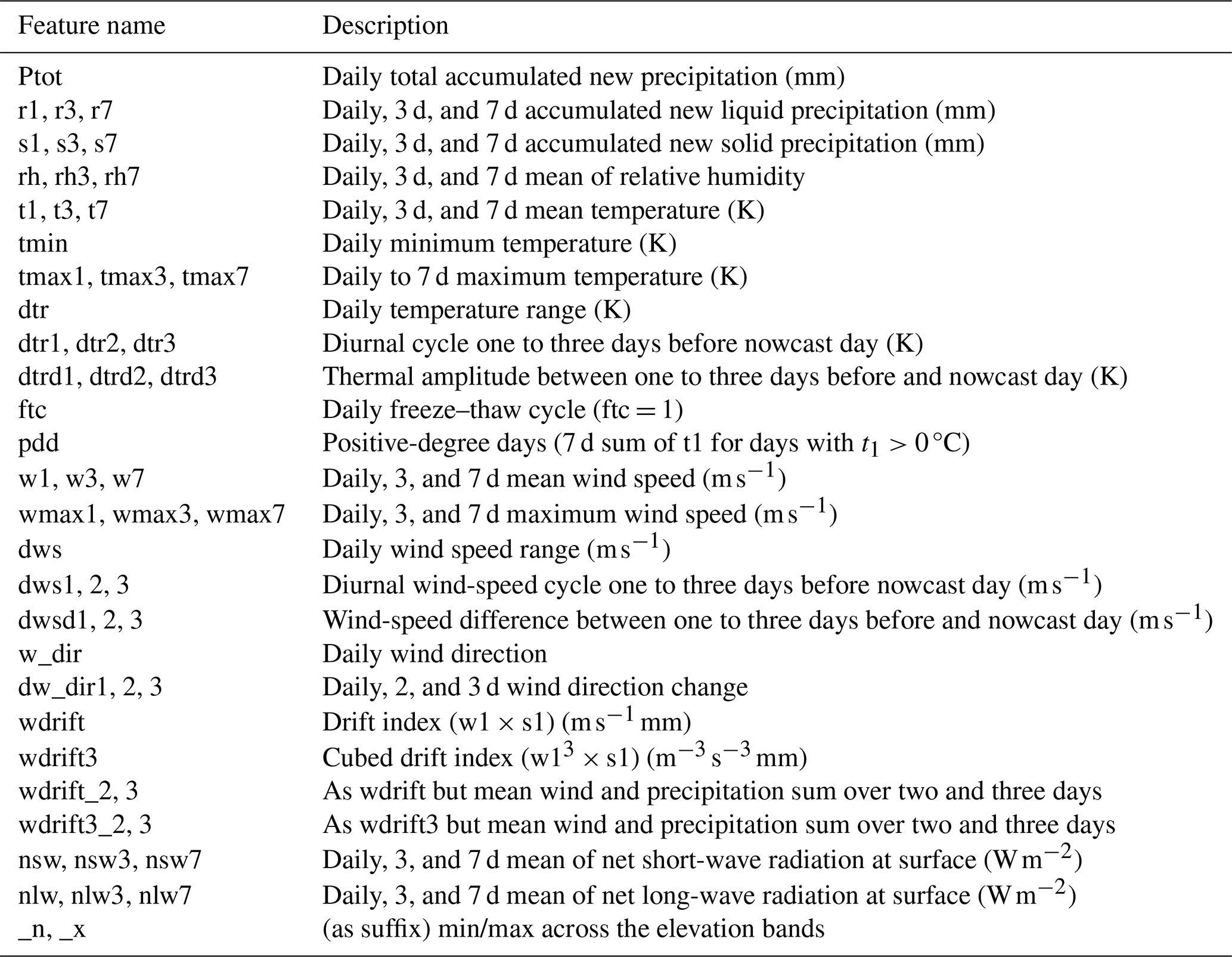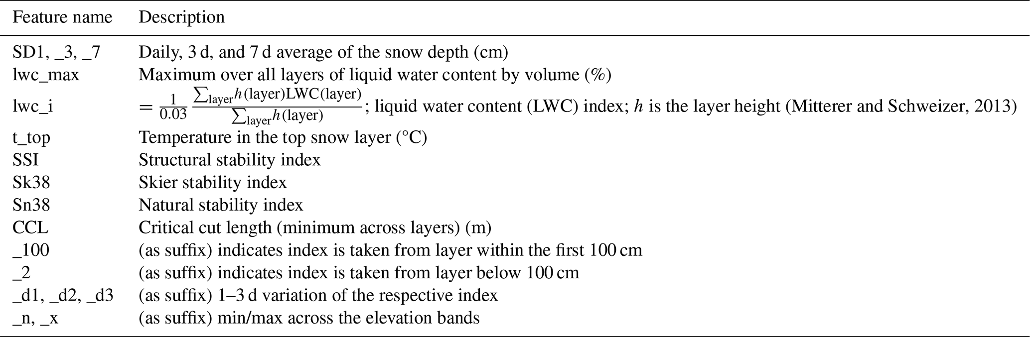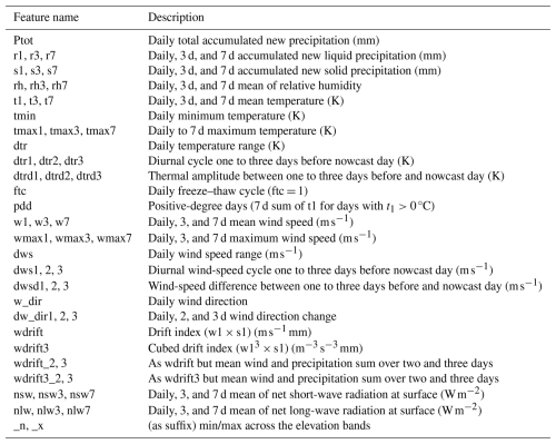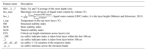 The predictive features used as input for the machine-learning (ML) models are presented in Tables C1 and C2 in Appendix C. They are selected based on basic physical understanding and on the results from earlier work (Zeidler and Jamieson, 2004; Mitterer and Schweizer, 2013; Conlan and Jamieson, 2016; Pérez-Guillén et al., 2022; Hendrick et al., 2023; Eiselt and Graversen, 2025). The meteorological features are mostly similar to Eiselt and Graversen (2025), but with important differences regarding the snow-cover information. Here the complex snow model SNOWPACK is utilised instead of the simple model seNorge (Saloranta, 2012, 2014, 2016). The predictive features derived from the SNOWPACK output include the snow depth (SD) as well as several stability indices (see Table C2). To derive these stability indices, the threshold sum approach (TSA; Monti et al., 2012), with the thresholds given in Monti et al. (2014), was performed on the SNOWPACK output to find the weak layers in the snowpack. Following Pérez-Guillén et al. (2022), we then determine one or two weak layers to extract the SNOWPACK-calculated stability indices Sk38 (skier stability index, Föhn, 1987; Jamieson and Johnston, 1998; Monti et al., 2016), Sn38 (natural stability index, Föhn, 1987; Jamieson and Johnston, 1998; Monti et al., 2016), and the structural stability index (SSI; Schweizer et al., 2006). If a weak layer is found within the first 100 cm of the snowpack, the suffix _100 is appended to the index name and the search is continued to find a deeper weak layer. The indices from the deeper layer (if found) are denoted with the suffix _2. Generally, larger values of these indices indicate a more stable snowpack.