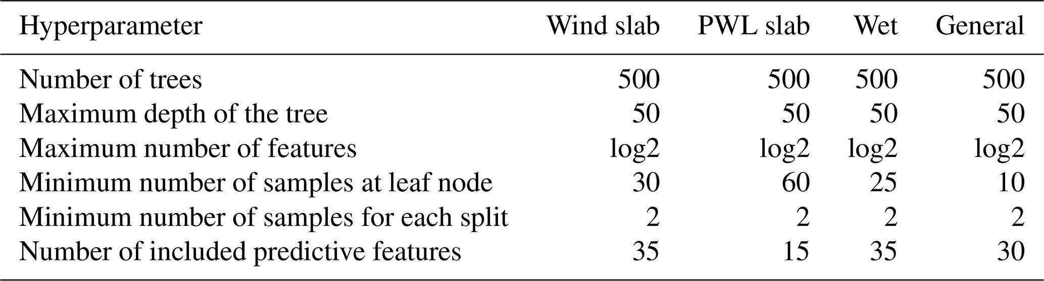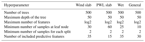 To establish the statistical linkage between meteorological data and avalanche danger we employ the widely used random forest (RF) model (Breiman, 2001), which “grows” a number of decision trees (DTs; Breiman et al., 1984) that “vote” on the final prediction result. Like Eiselt and Graversen (2025) we use the RF implementation from the Python library scikit-learn version 1.3.0 (https://scikit-learn.org/, last access: 23 September 2025). One RF model is trained for each AP, resulting in four different RF models. The hyperparameter setups for the individual RF models are presented in Table E1 in Appendix E. To produce the data set for the RF model training, the AvD/non-AvD data from the Norwegian avalanche bulletin (Sect. 2.1) are combined with the predictive features derived from NORA3 and SNOWPACK (Sect. 2.5). Note that this restricts the available data for model training to the period 2016/2017–2023/2024. The data were split into a test (winters ending in 2021 and 2023) and training (remaining winters) data set.