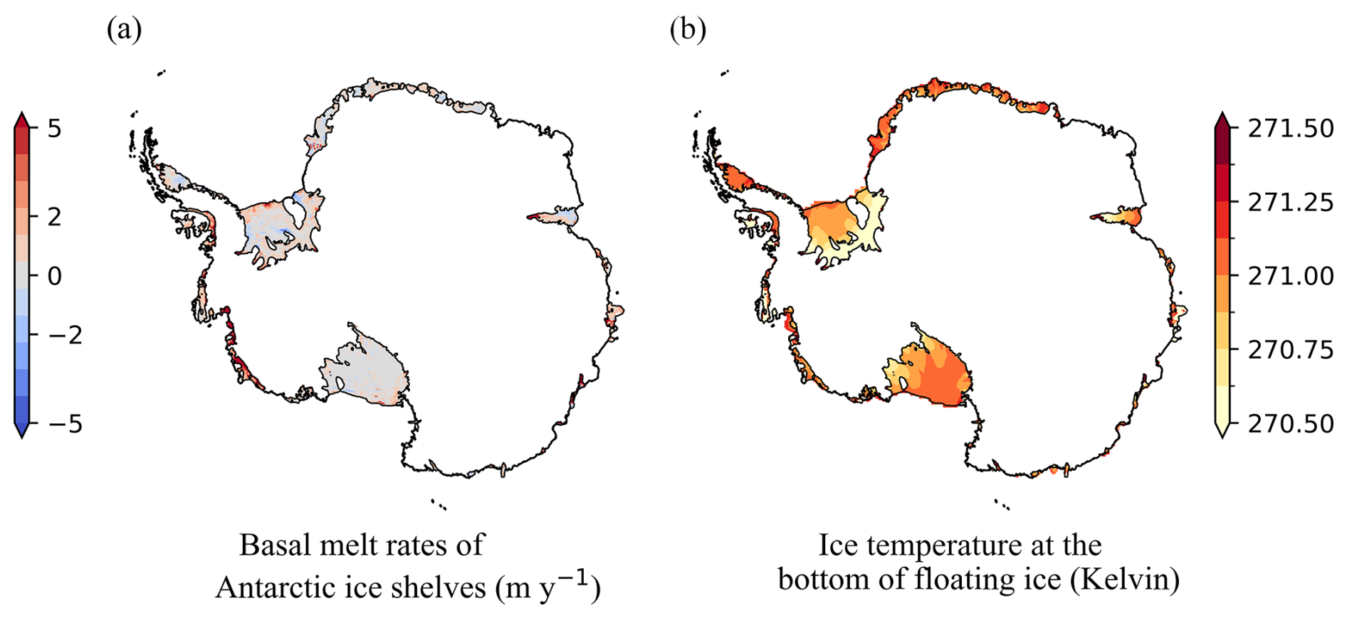 Figure 1Ocean conditions used in S1 spin-up. (a) observation of sub-ice shelf basal melt rates (Rignot et al., 2013); (b) Temperature field beneath ice shelves (Chambers et al., 2021).