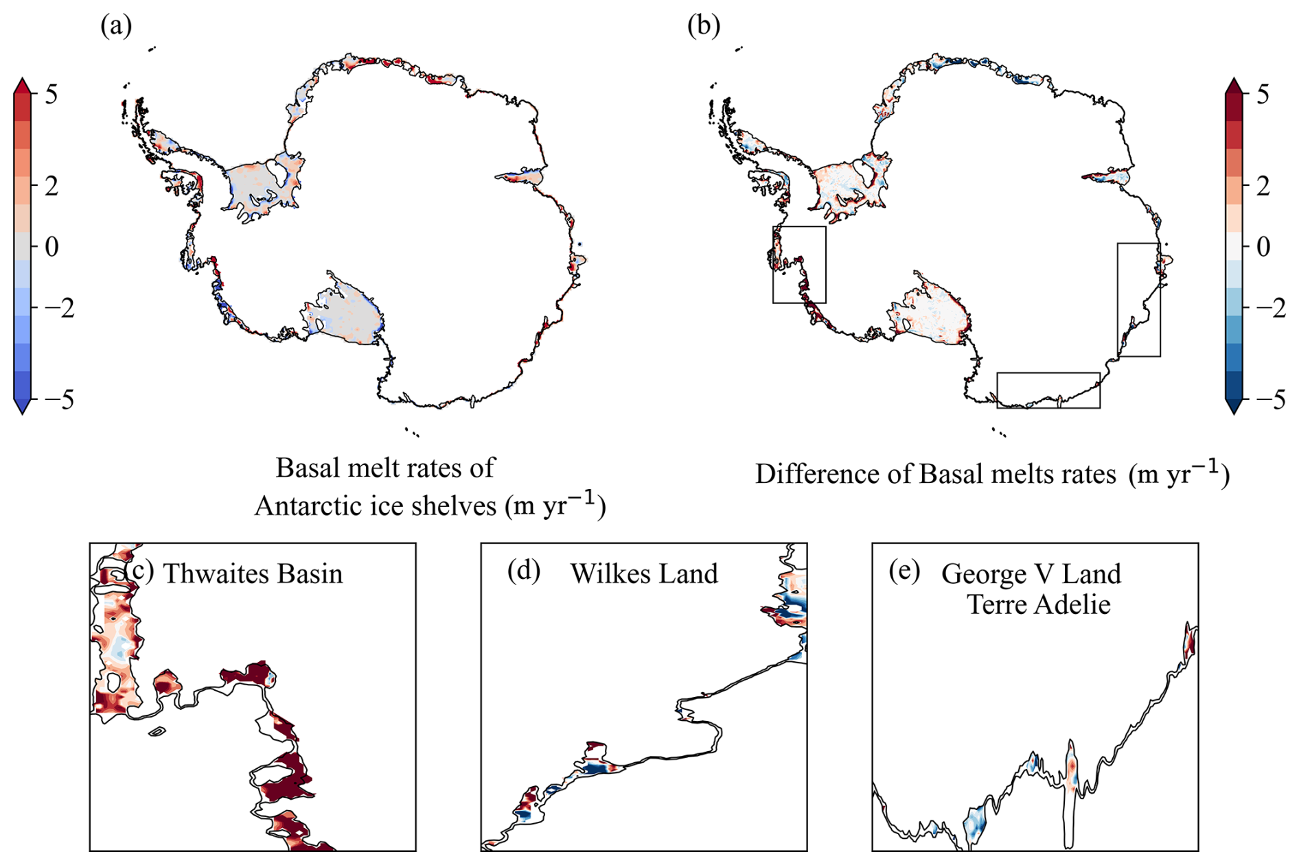 Figure 2Comparison of initial sub-ice shelf melt rates between S1 and S2 spin-ups. (a) Sub-ice shelf melt rates derived from the TF-linear parameterization (S2). (b) Difference in basal melt rates (S1–S2). Regions of interest are highlighted by black boxes: (c) Thwaites Basin, (d) Wilkes Land, and (e) George V Land–Terre Adelie.